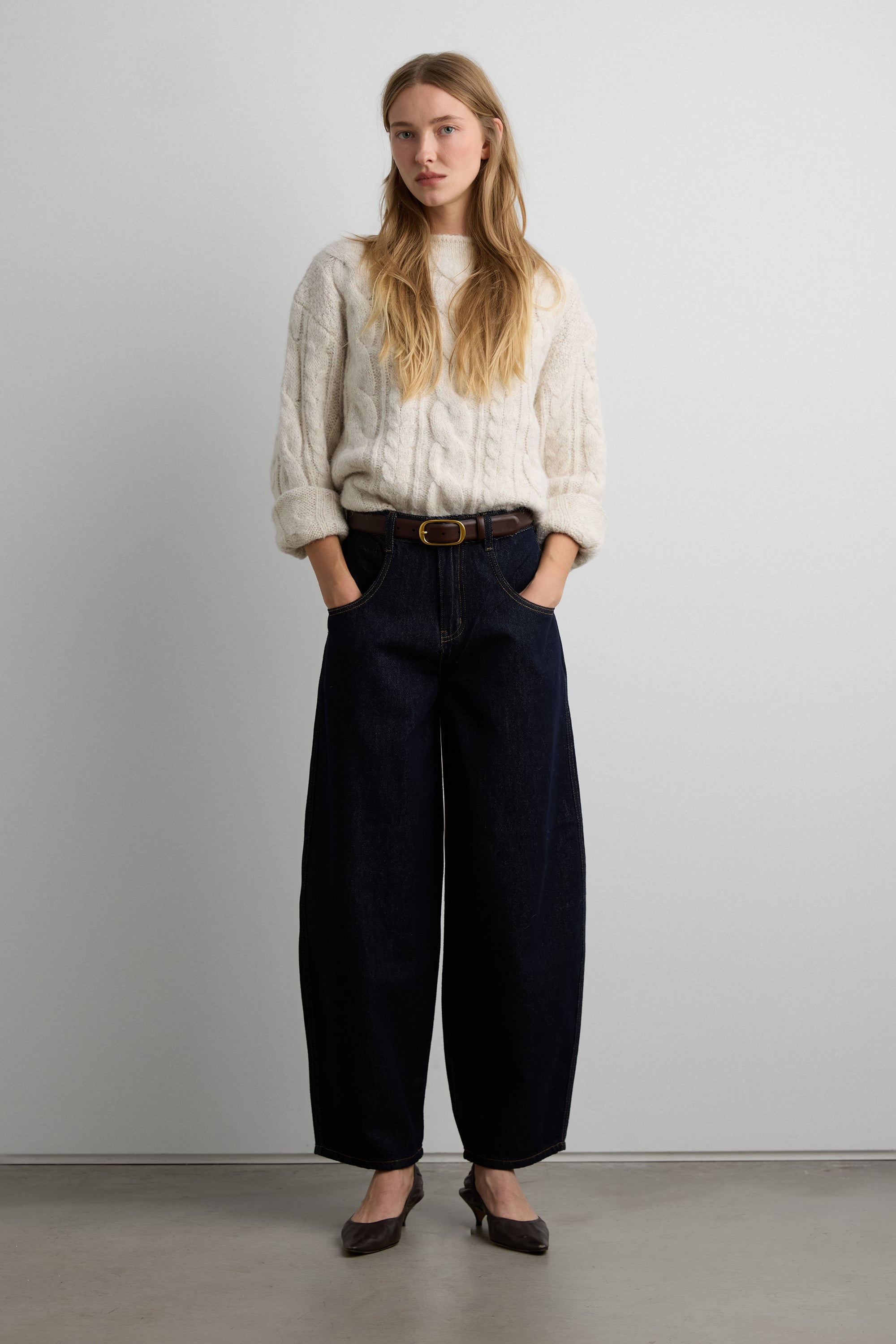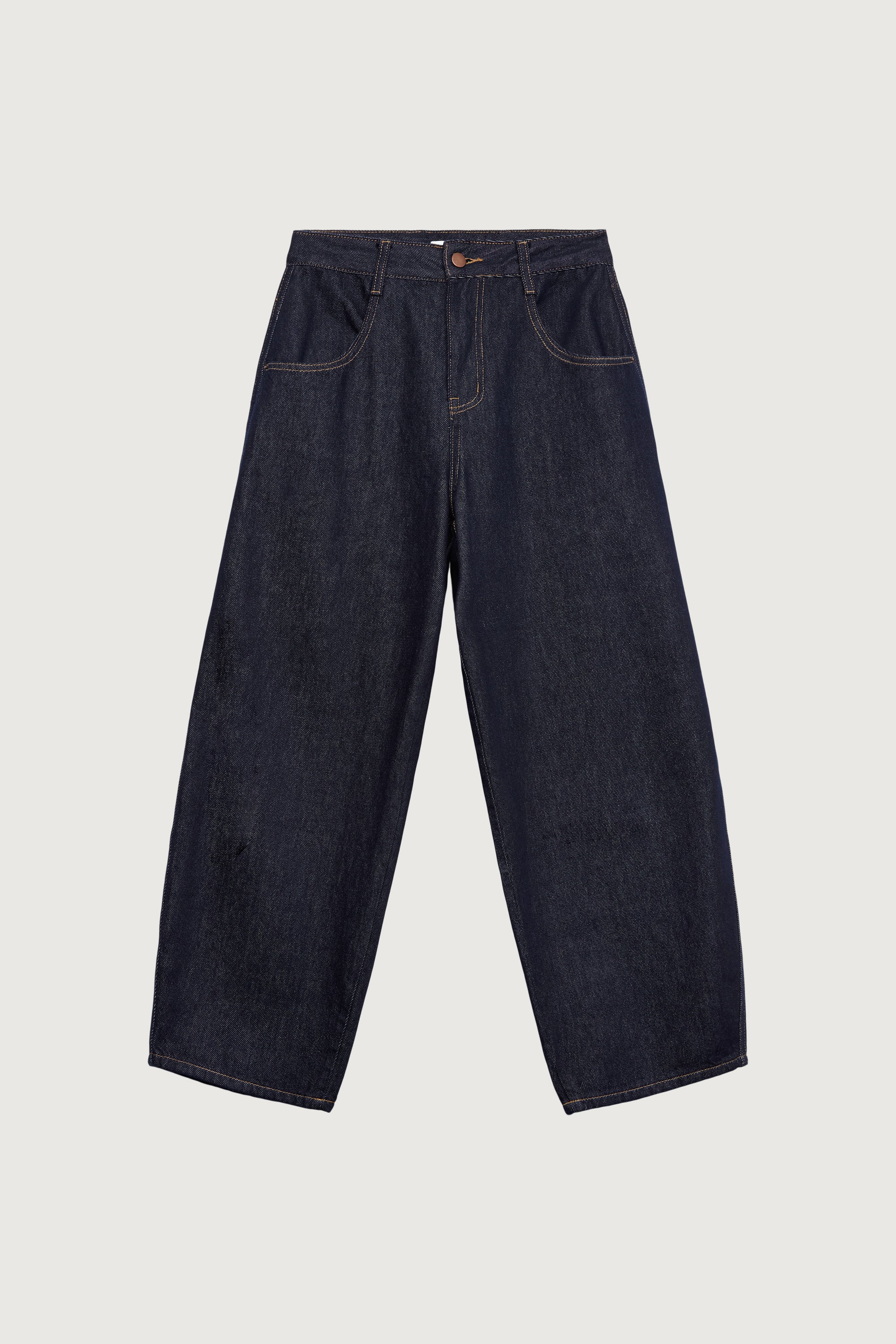 These barrel jeans are cut from a mid-weight, non-stretch dark wash denim and sits high on the waist. It's made for a relaxed fit and is complete with front and back patch pockets and contrast stitch details.