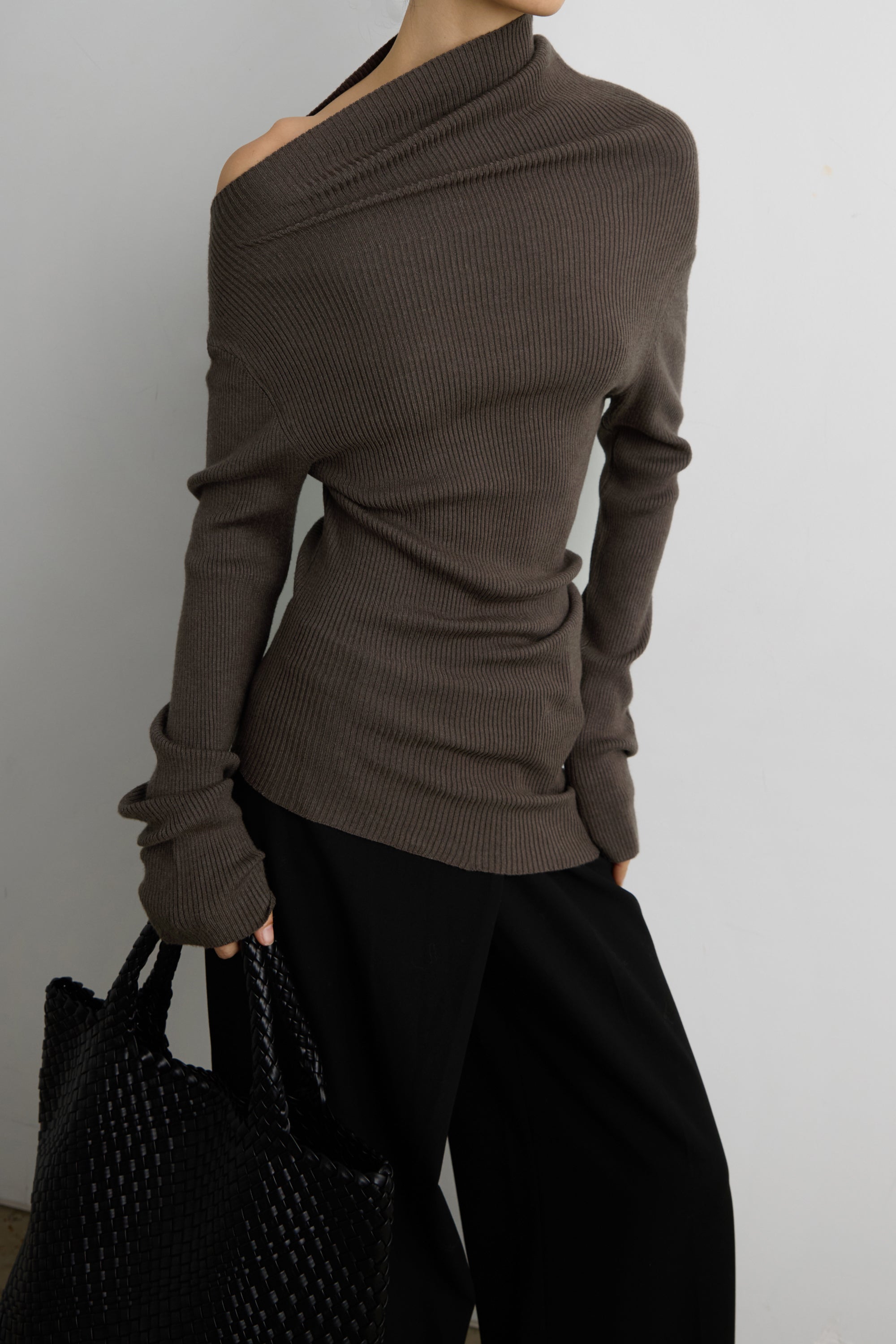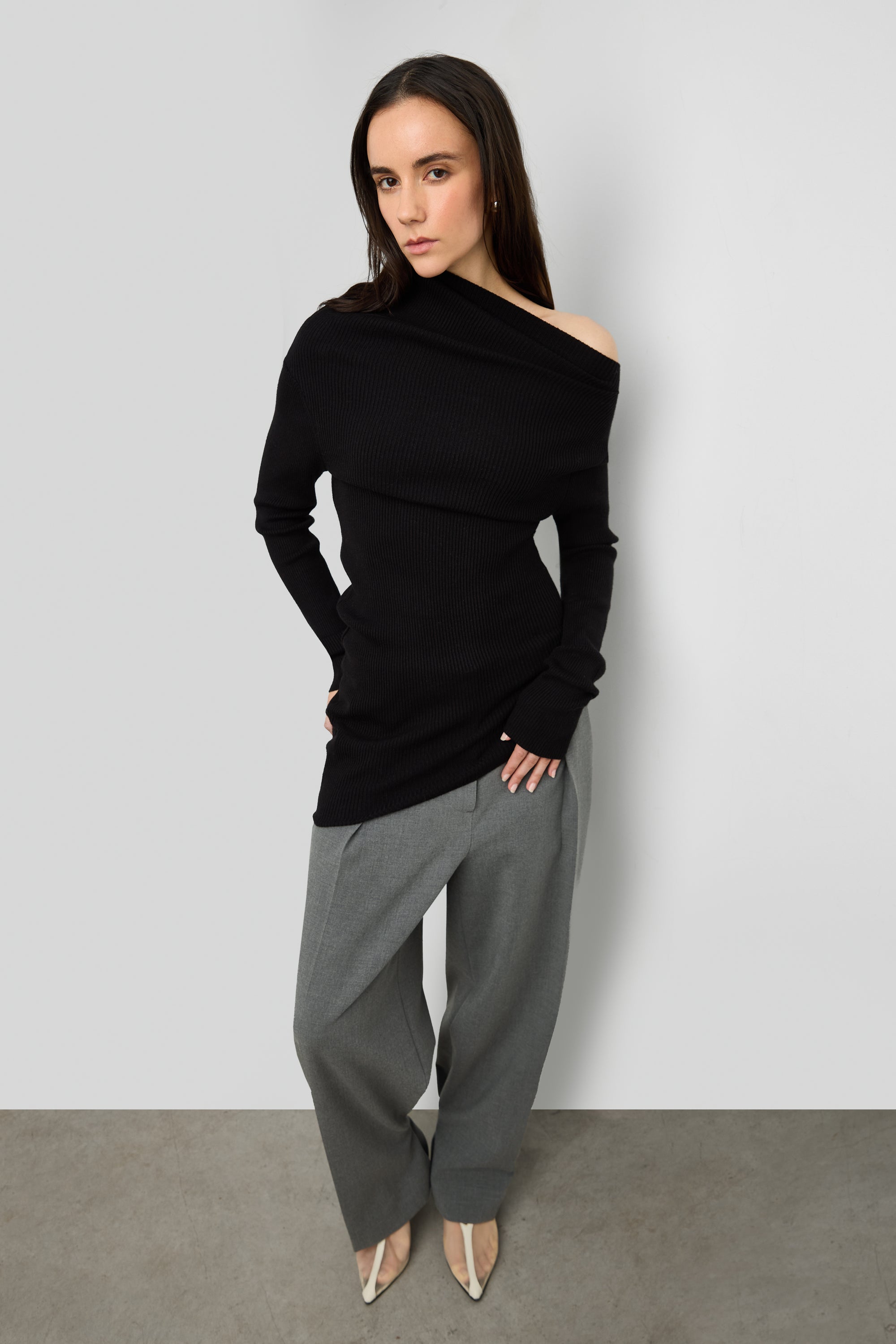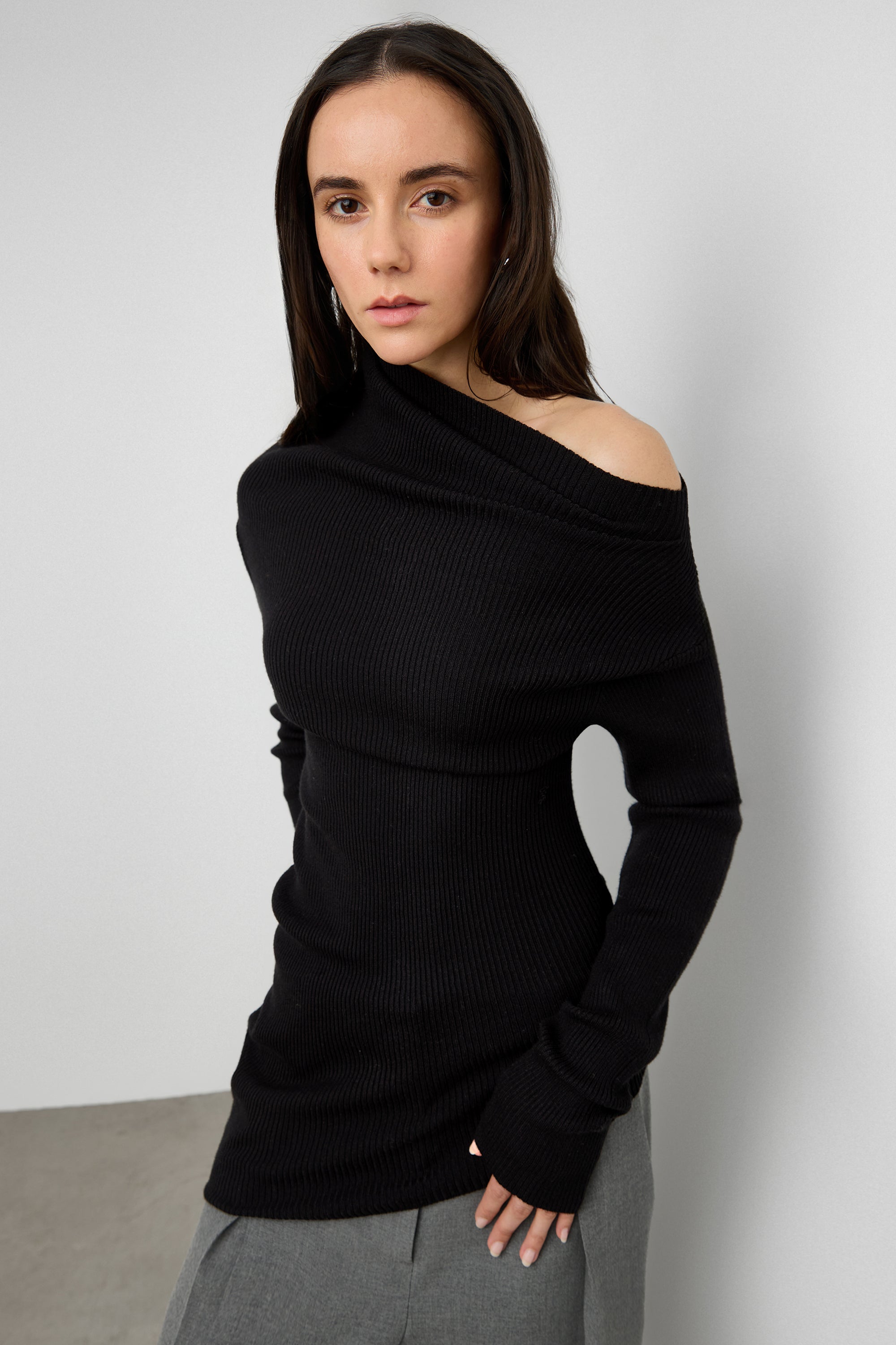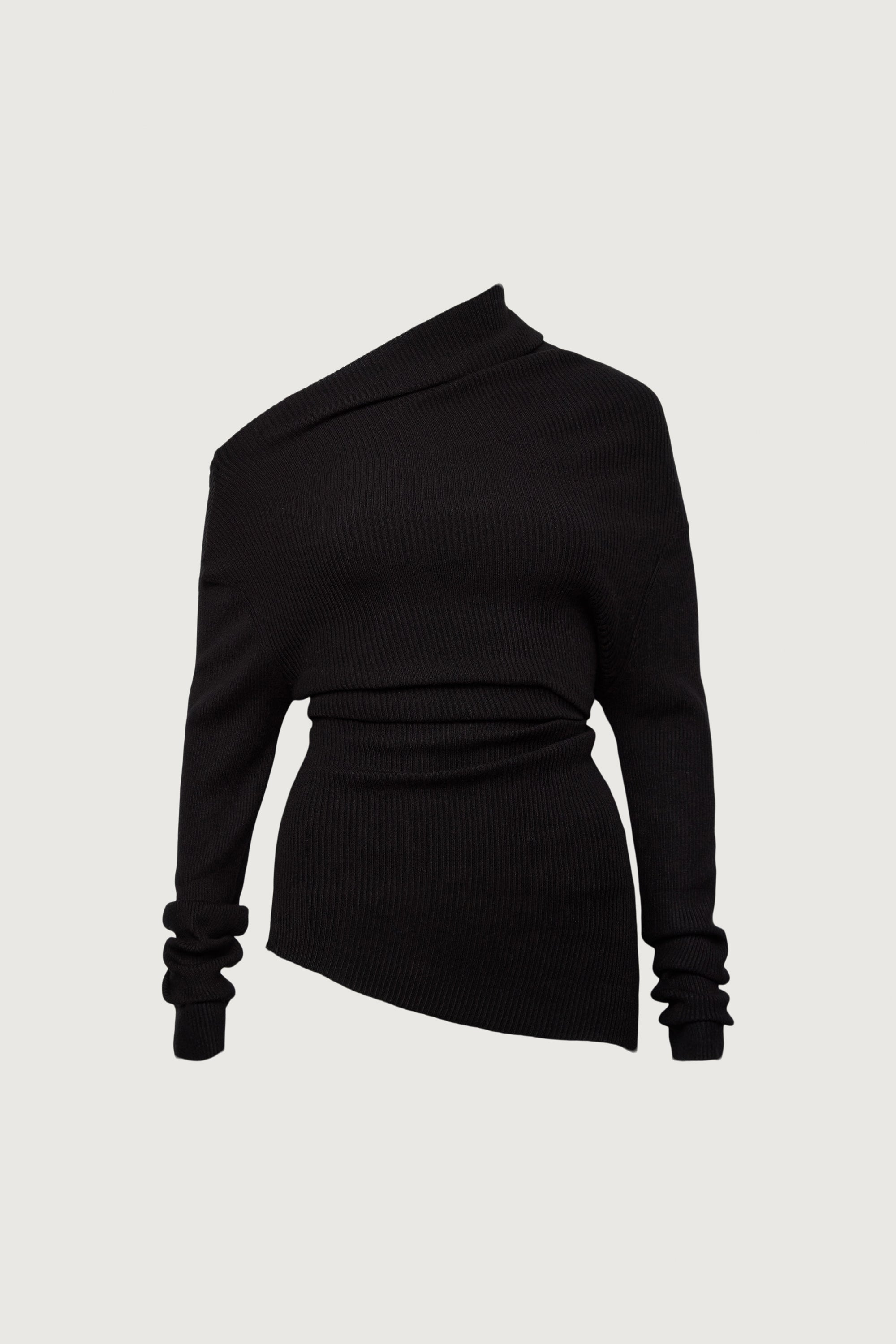 This draped off-shoulder knit top is crafted from a soft, stretchy rib knit that contours the body while creating a fluid, asymmetrical neckline. Designed with extended sleeves and a sculpted fit, it brings a refined yet effortless edge to cold-weather dressing. Pair it with tailored trousers or denim for a modern, elevated look.