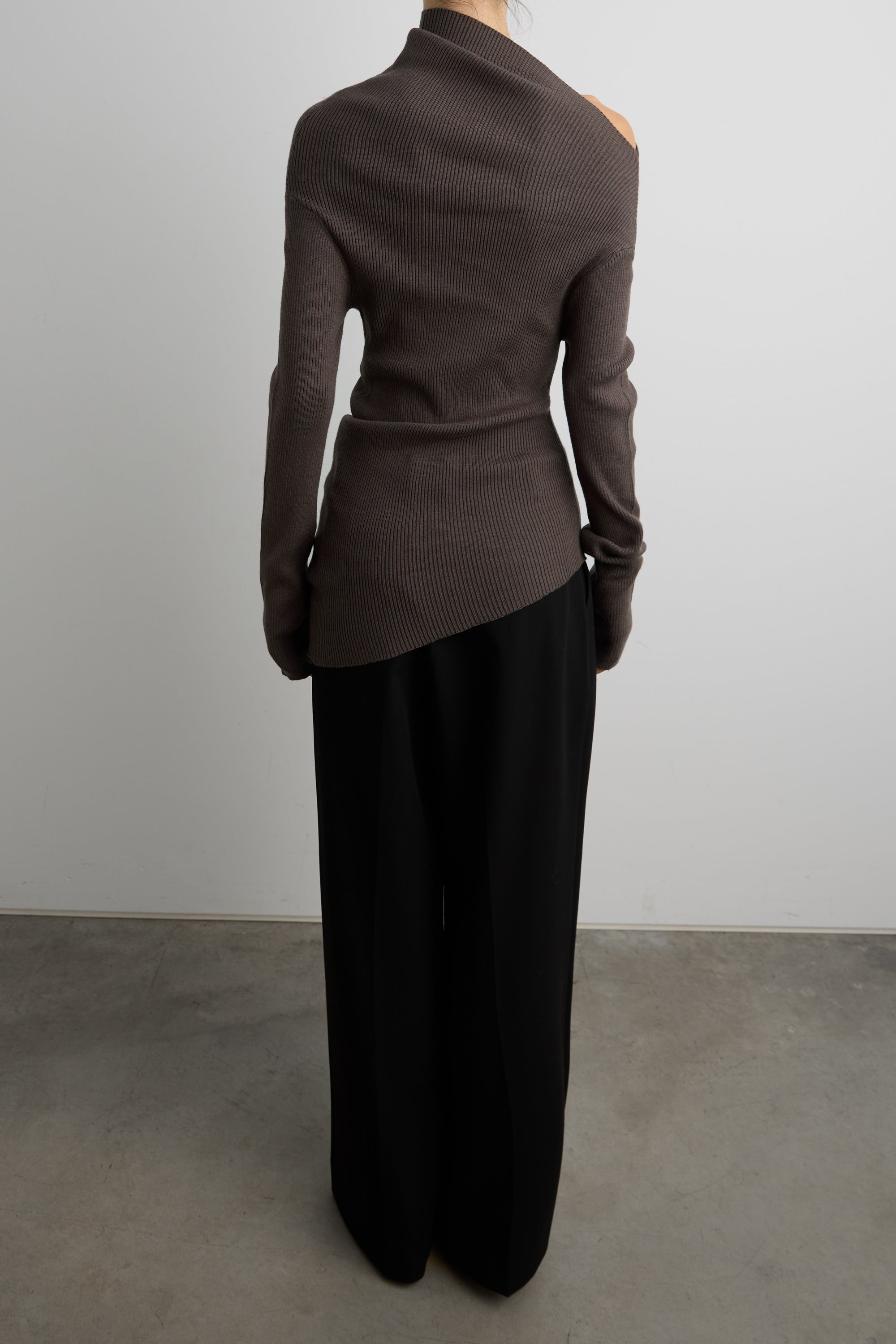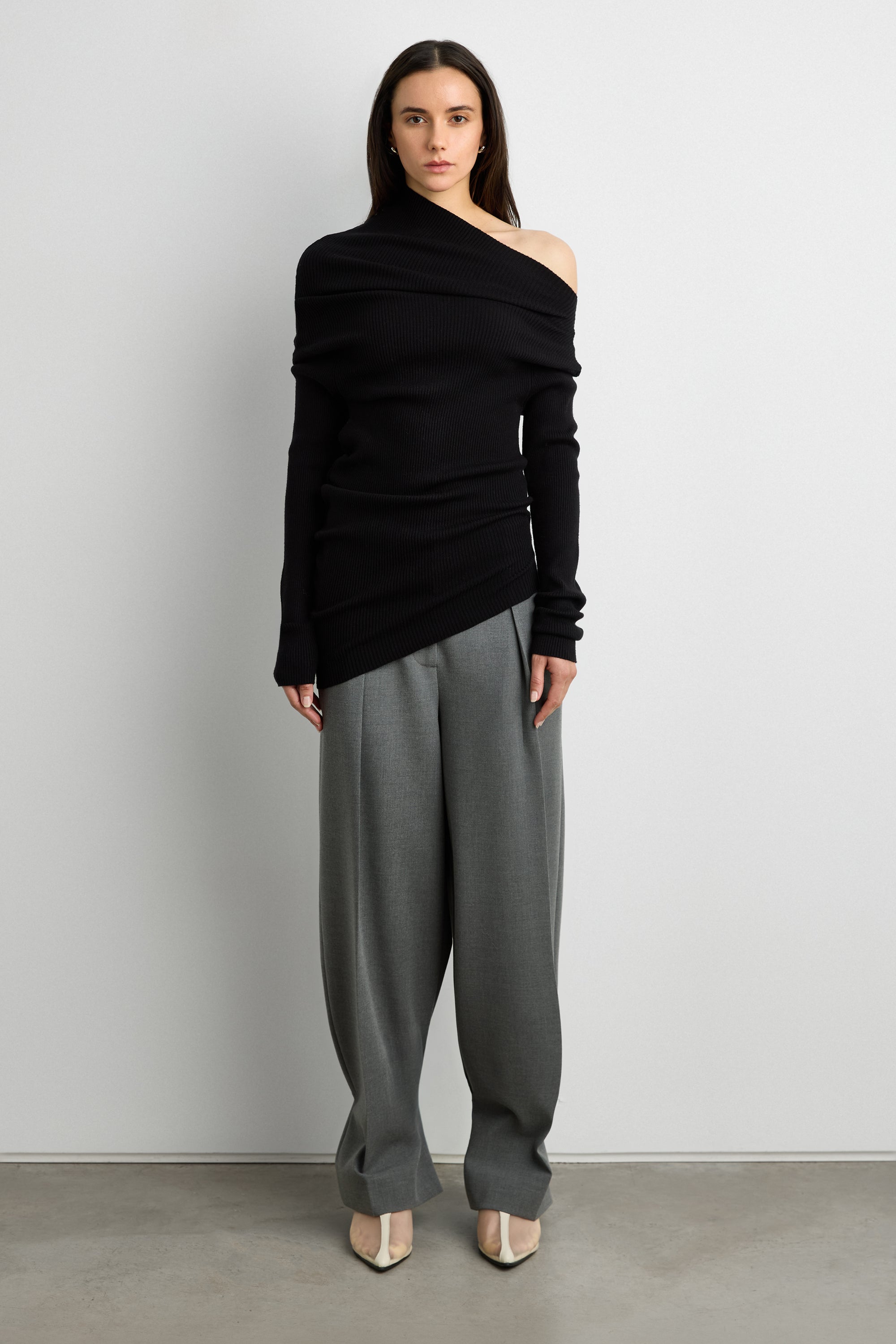 Rib knit fabric. Asymmetric draped neckline. Off-shoulder design.