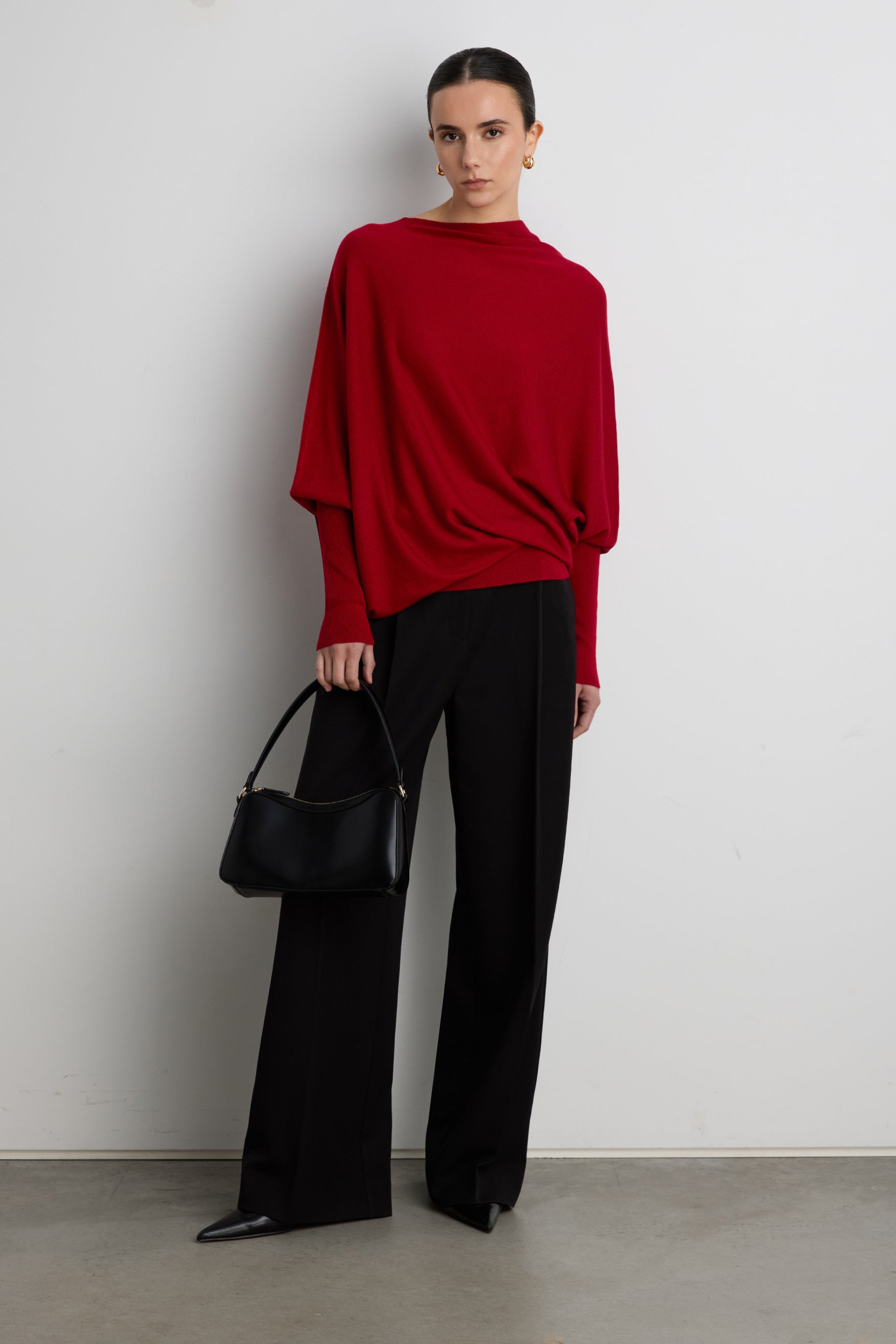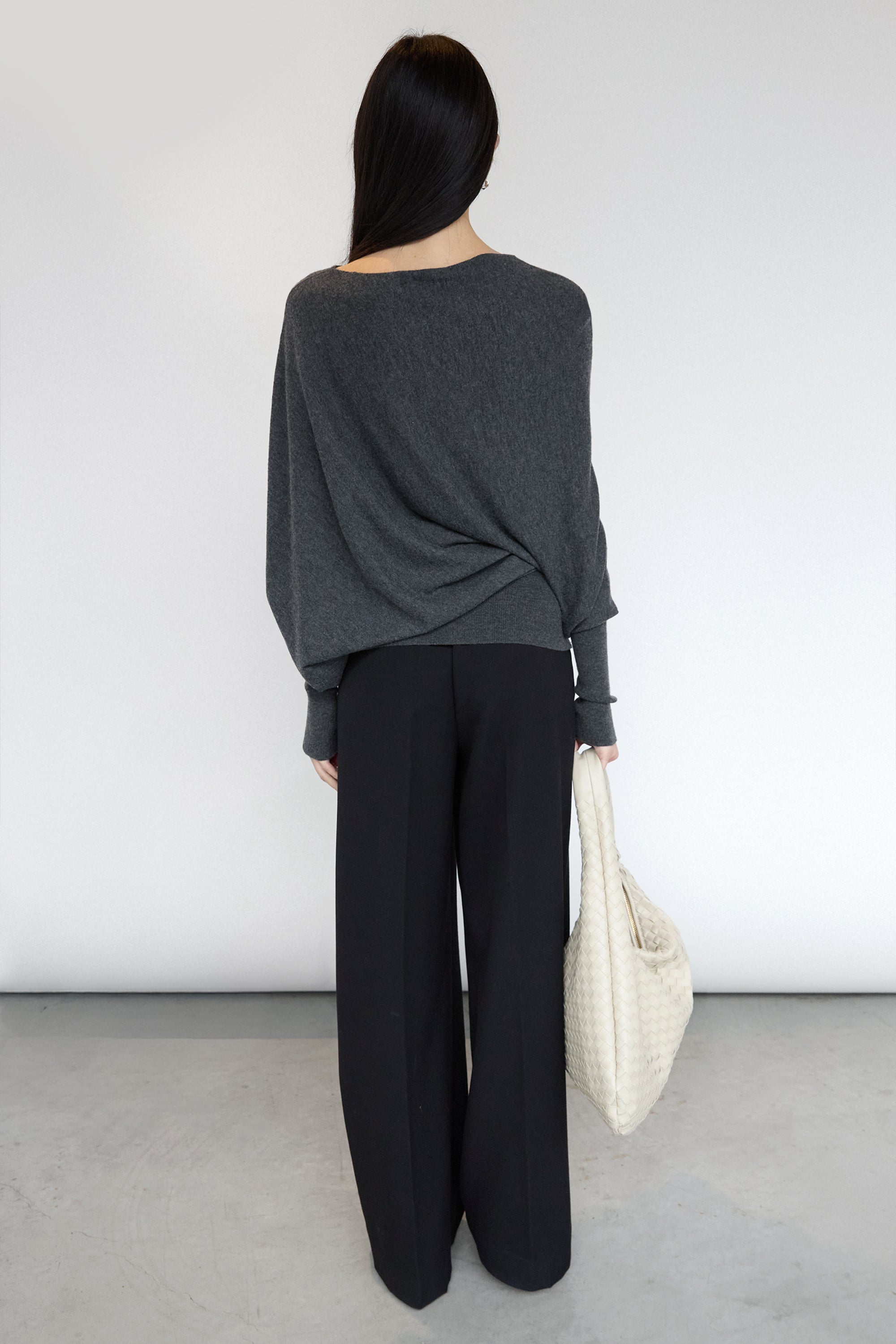 This asymmetrical sweater features a relaxed fit with subtle draping through the body and a refined cuffed sleeve detail for added structure. It has touches of wool for added softness and it's an easy, modern knit designed to elevate everyday looks with minimal effort. You can even wear yours as a mini dress.