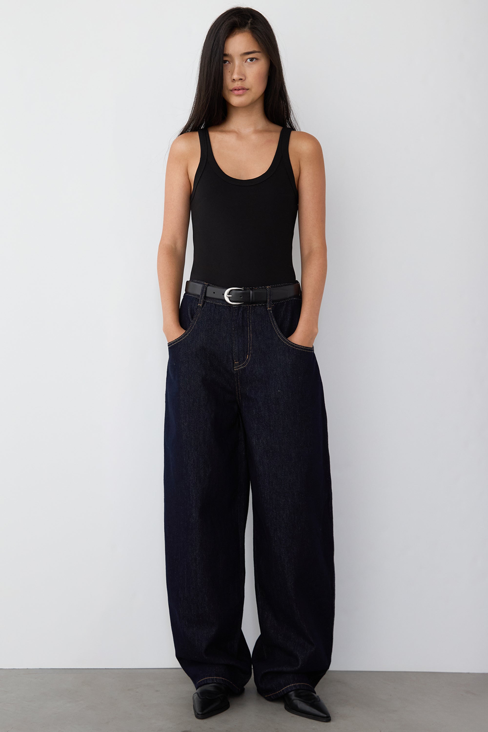 These barrel jeans are cut from a mid-weight, non-stretch dark wash denim and sits high on the waist. It's made for a relaxed fit and is complete with front and back patch pockets and contrast stitch details.