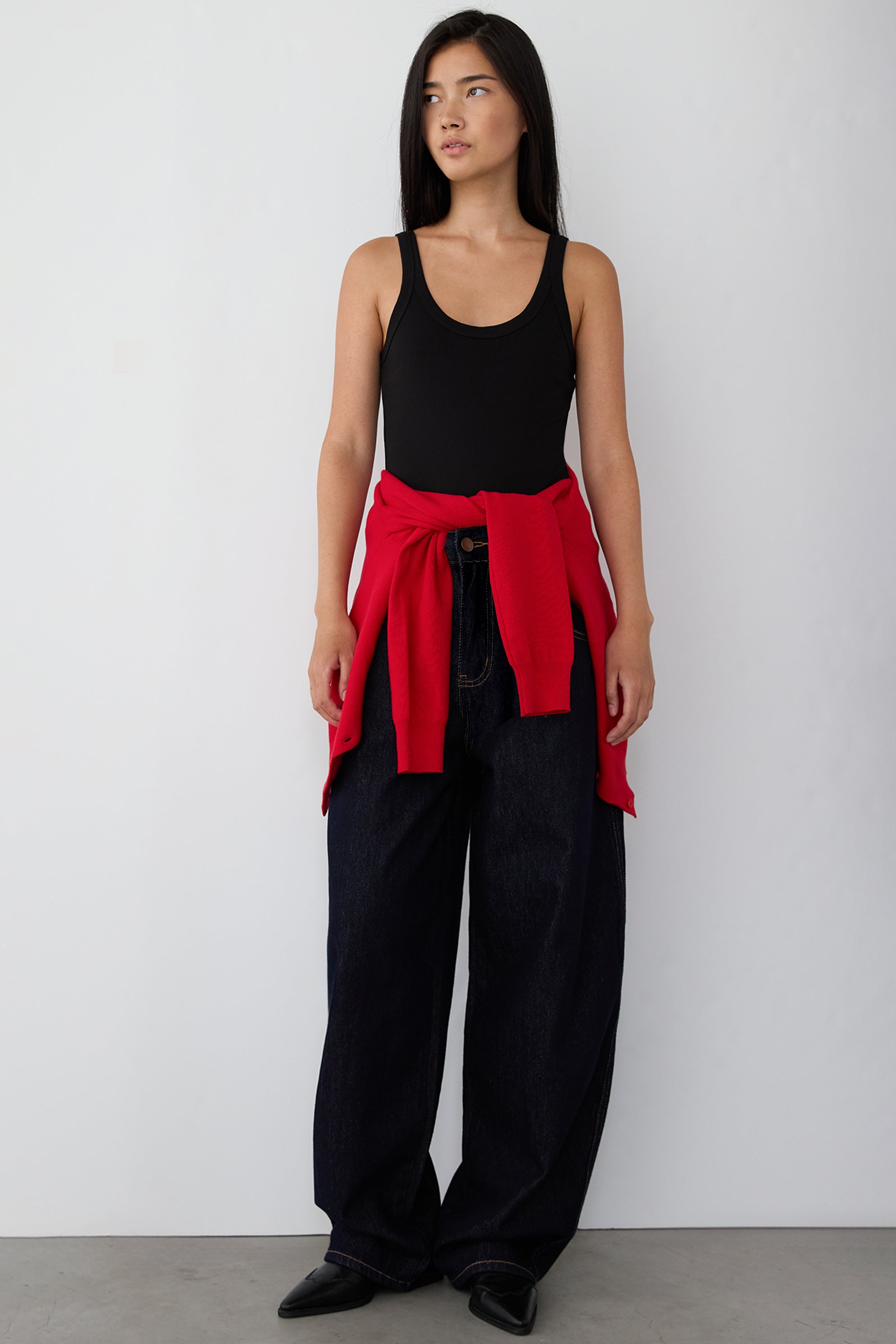 High-rise waist. Curved leg. Mid-weight. Non-stretch. Four pockets. Zipper and button fly. Top stitching. Belt loop.