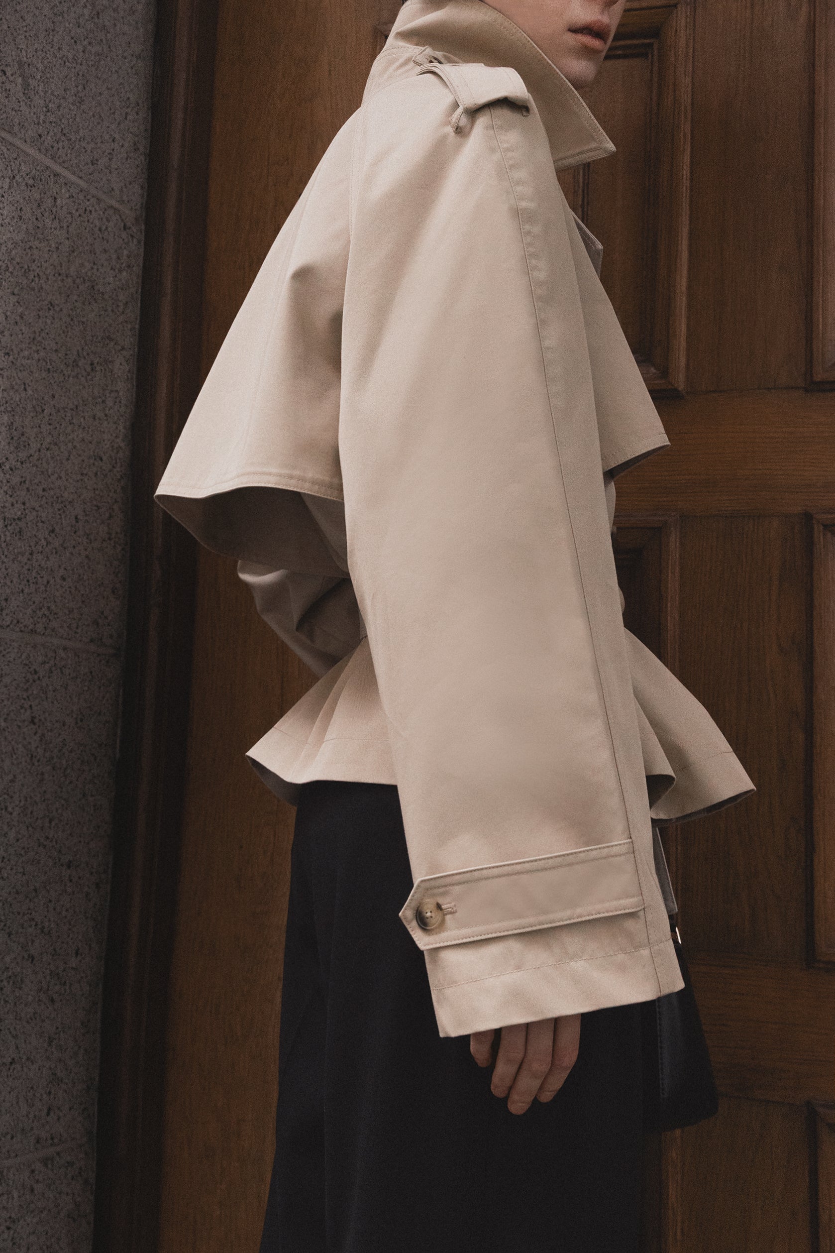 Cotton blend with water resistant coating. Collar with belt detail. Epaulettes. Storm flap. Double-breasted front. Belted waist. Button sleeve details.