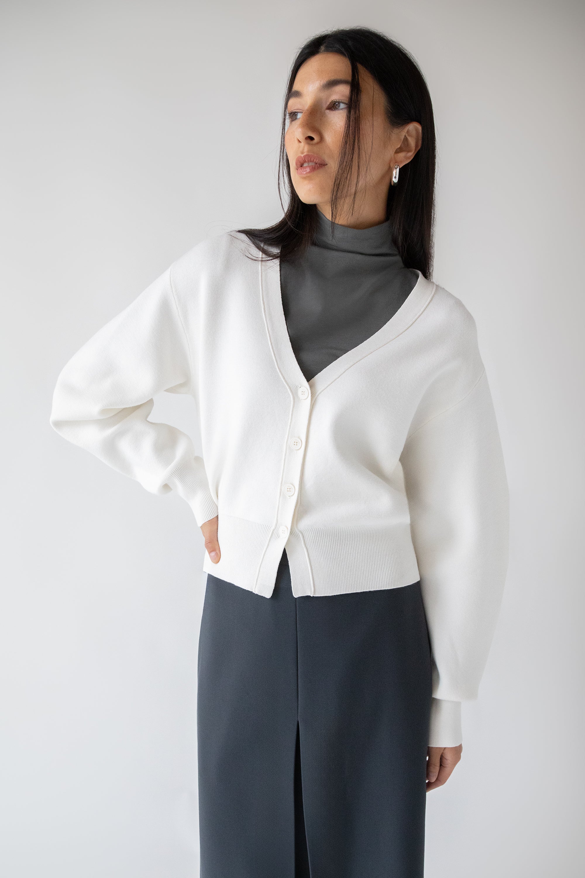 This cropped cardigan is lightweight and made in a relaxed fit for easy layering. It has ribbed trims, a button front and and semi-slouchy sleeves. Wear it with a slip dress or layer it over a basic tank.