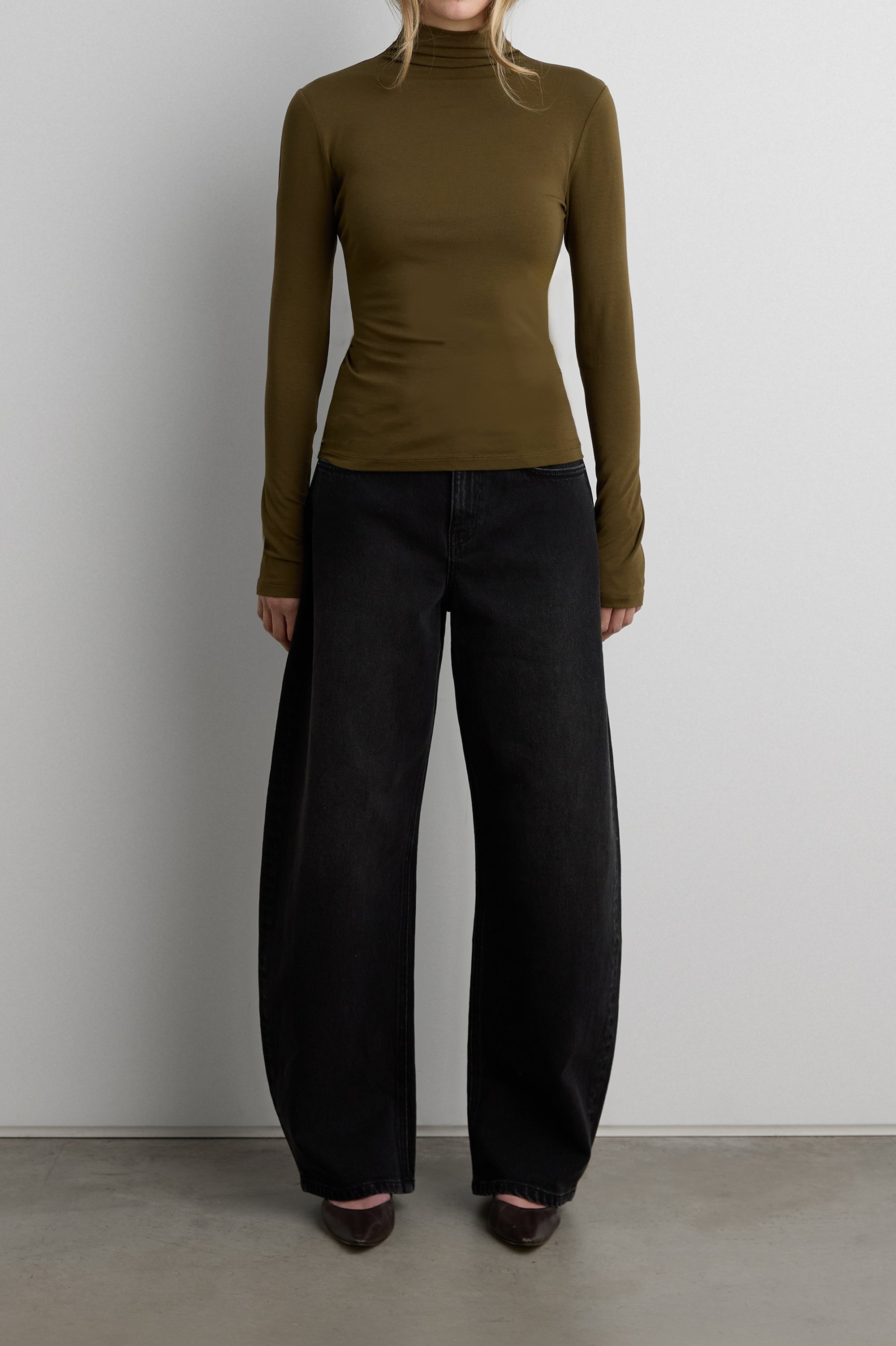 Cut from a soft cotton-modal blend, this basic mock neck long sleeve top has a fitted silhouette to easily tuck into any bottoms. An essential layering piece to transition into the fall and winter season, wear yours with pleated pants and heeled mules.