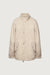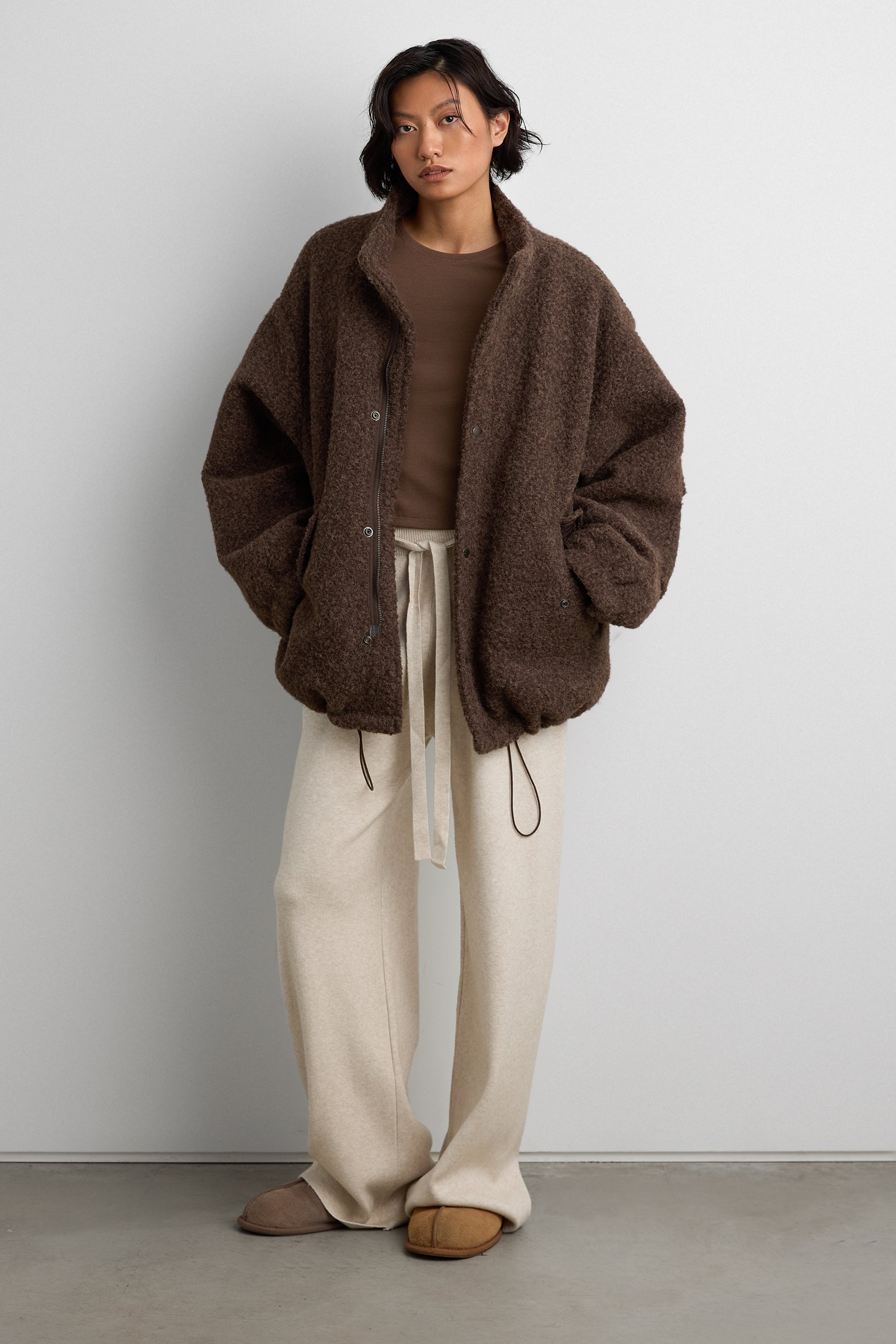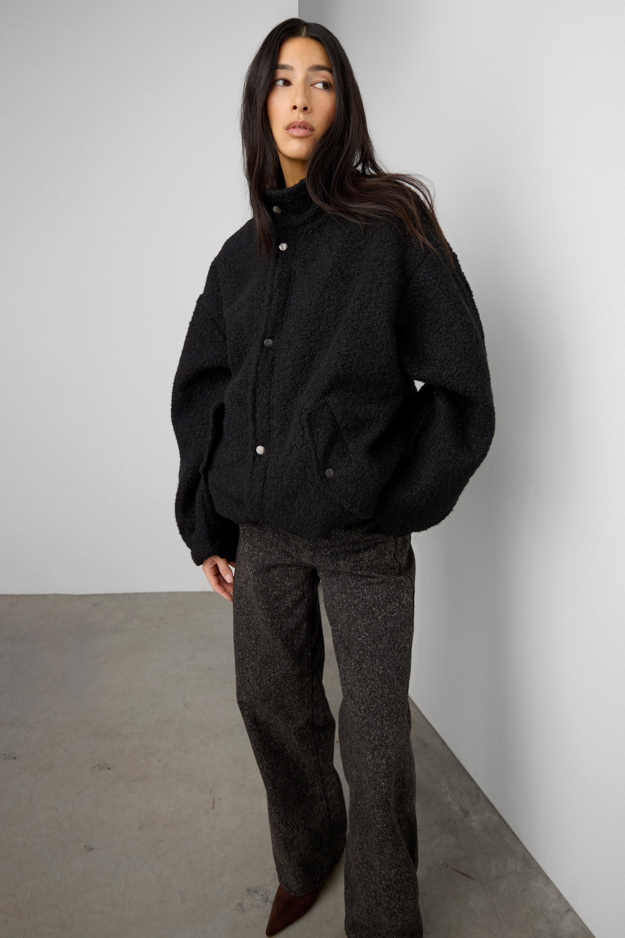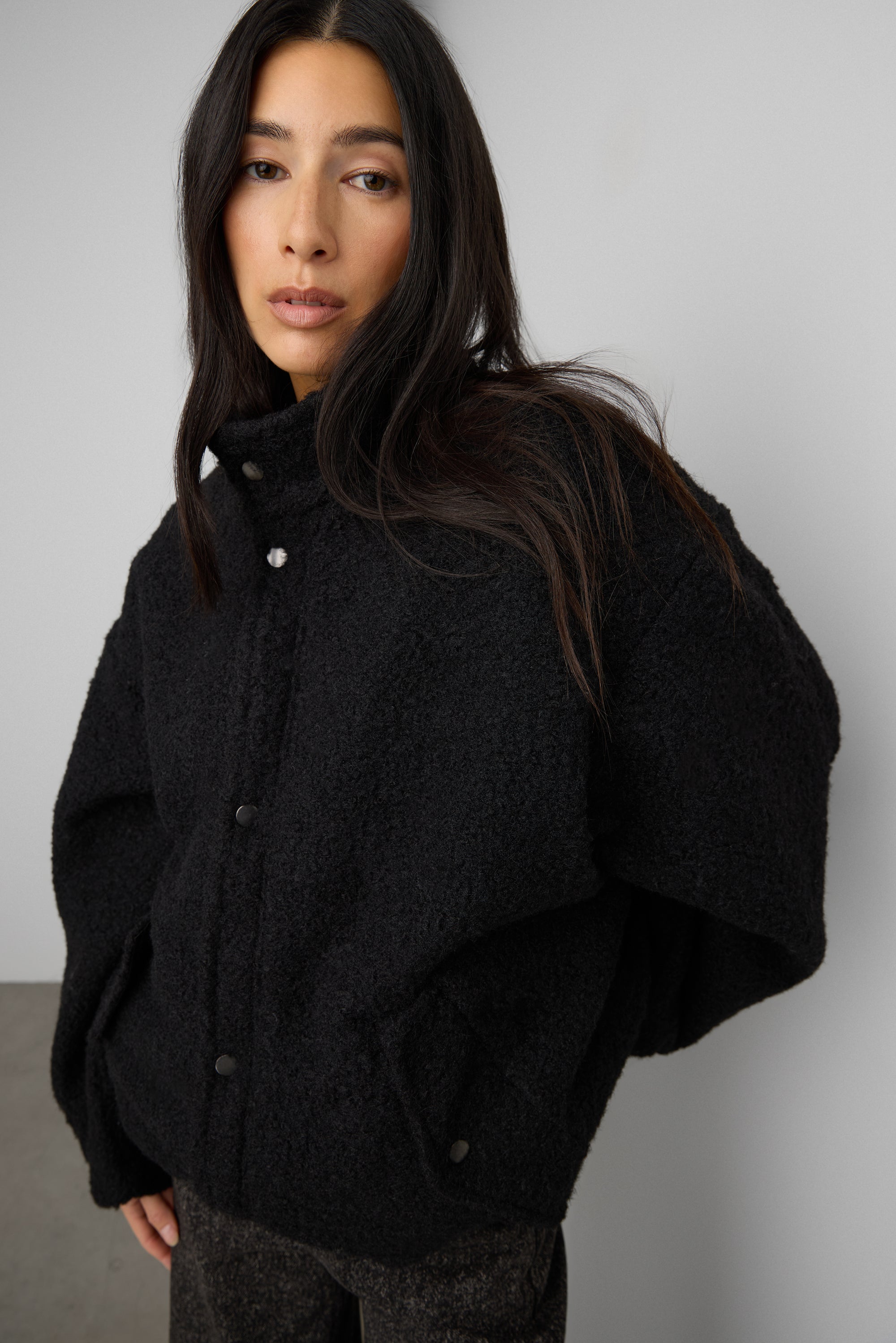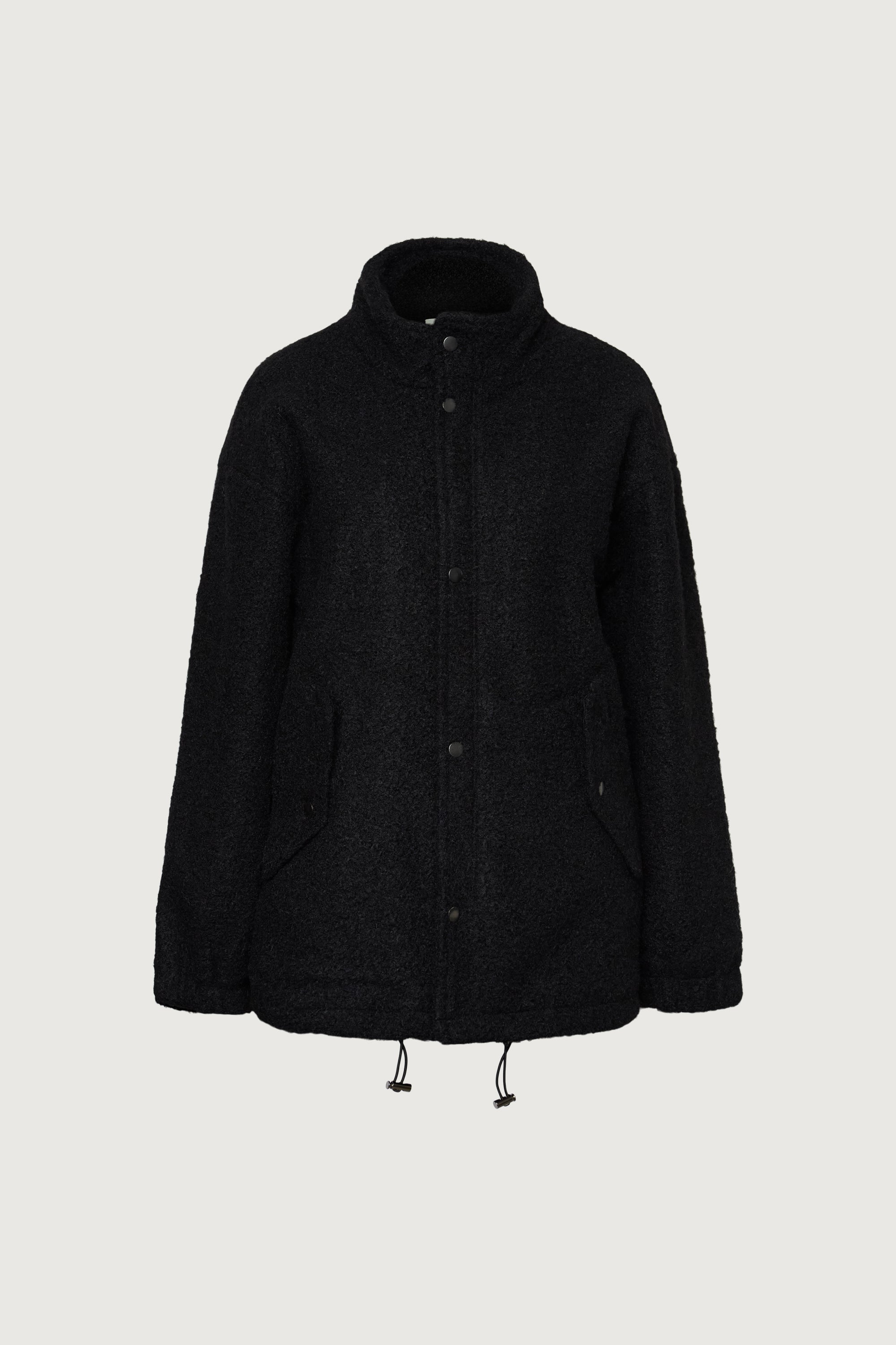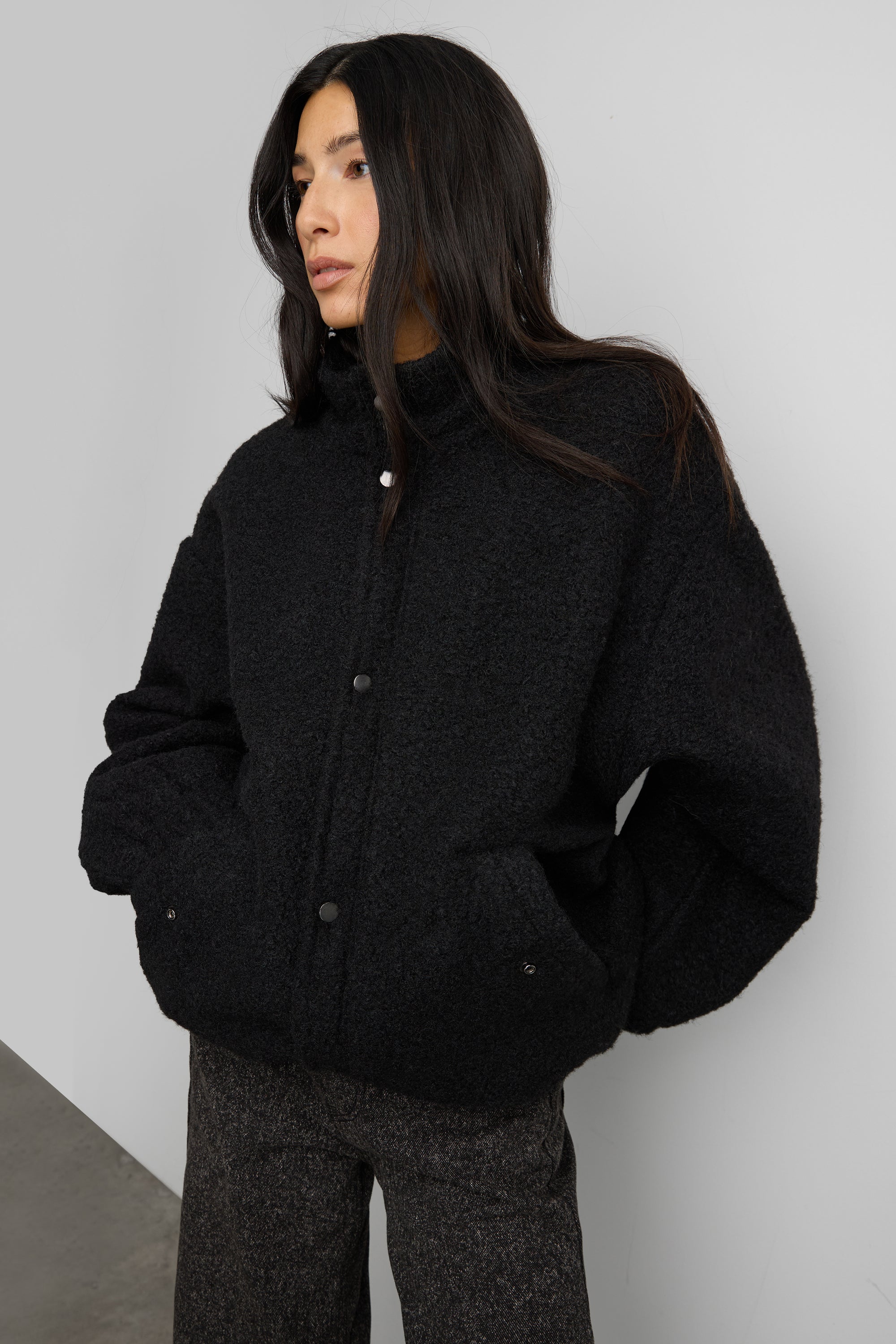 Boucle textured fabric. Snap-button closure. Front pockets. Stand collar.
