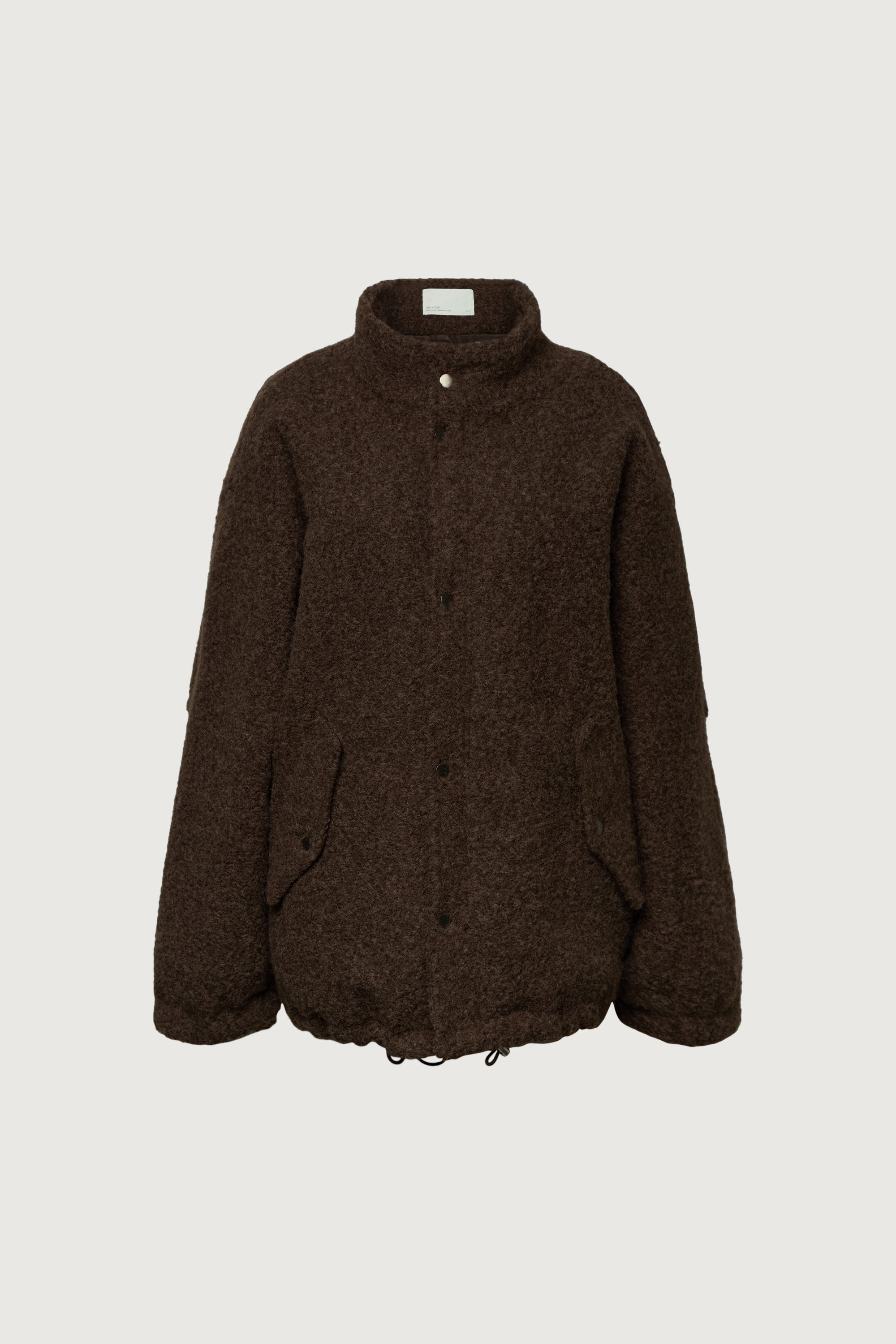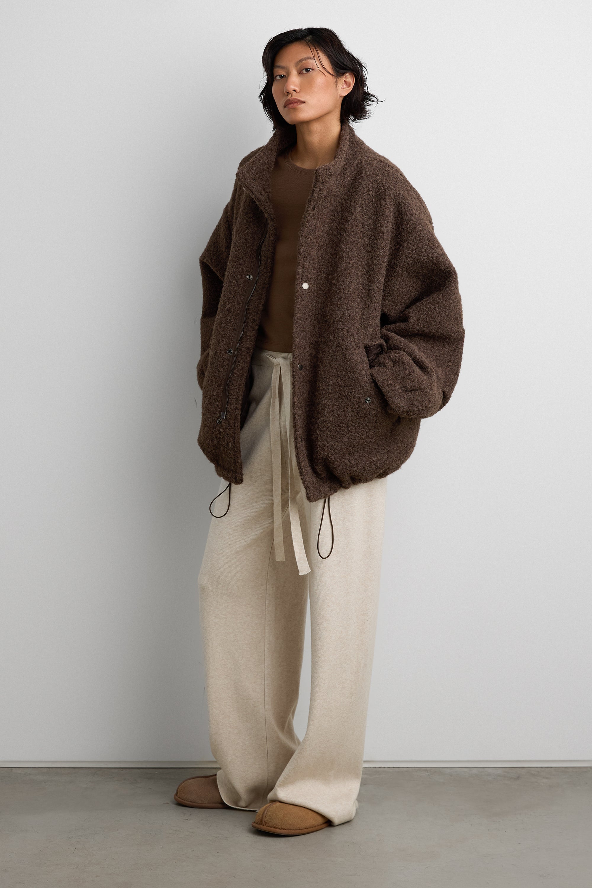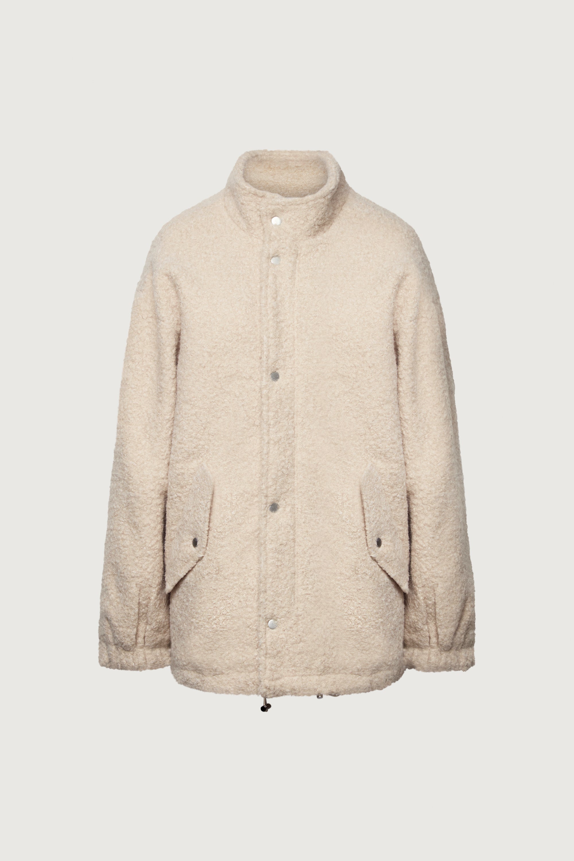 This oversized sherpa jacket is crafted from a soft, textured wool blend boucle fabric designed for warmth and ease. Finished with snap-button closures and roomy front pockets, it offers a relaxed silhouette perfect for layering through colder months. Style it over knits or denim for an effortlessly cozy look.