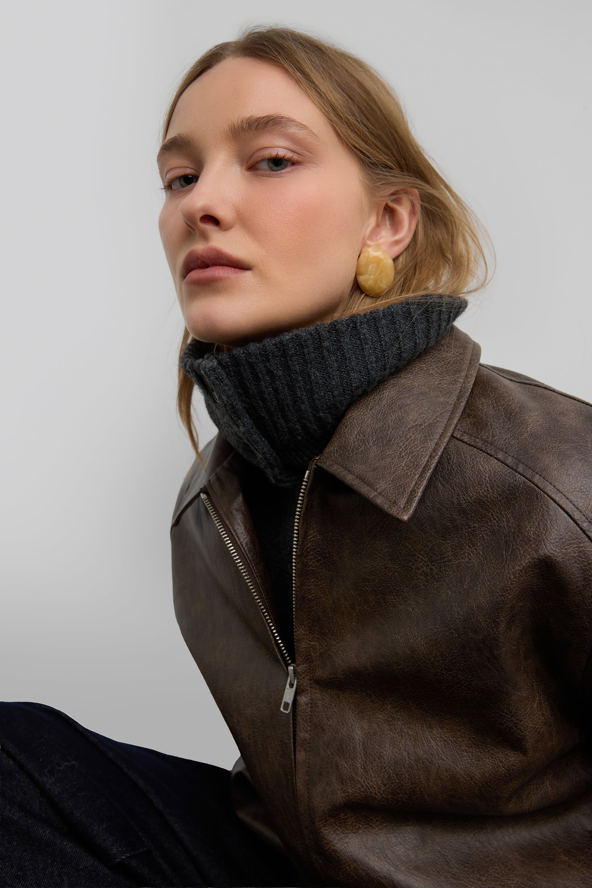 Mid-weight knit. High neckline. Button front. Ribbed trims.