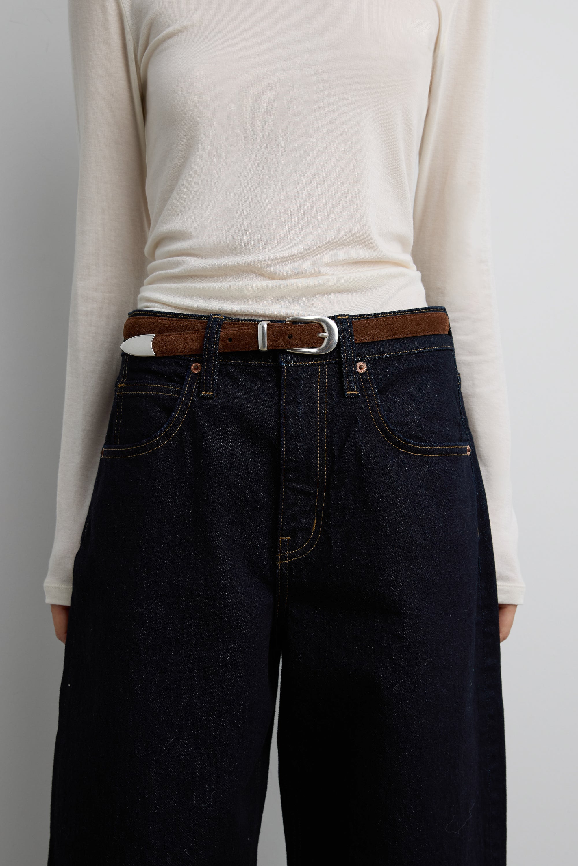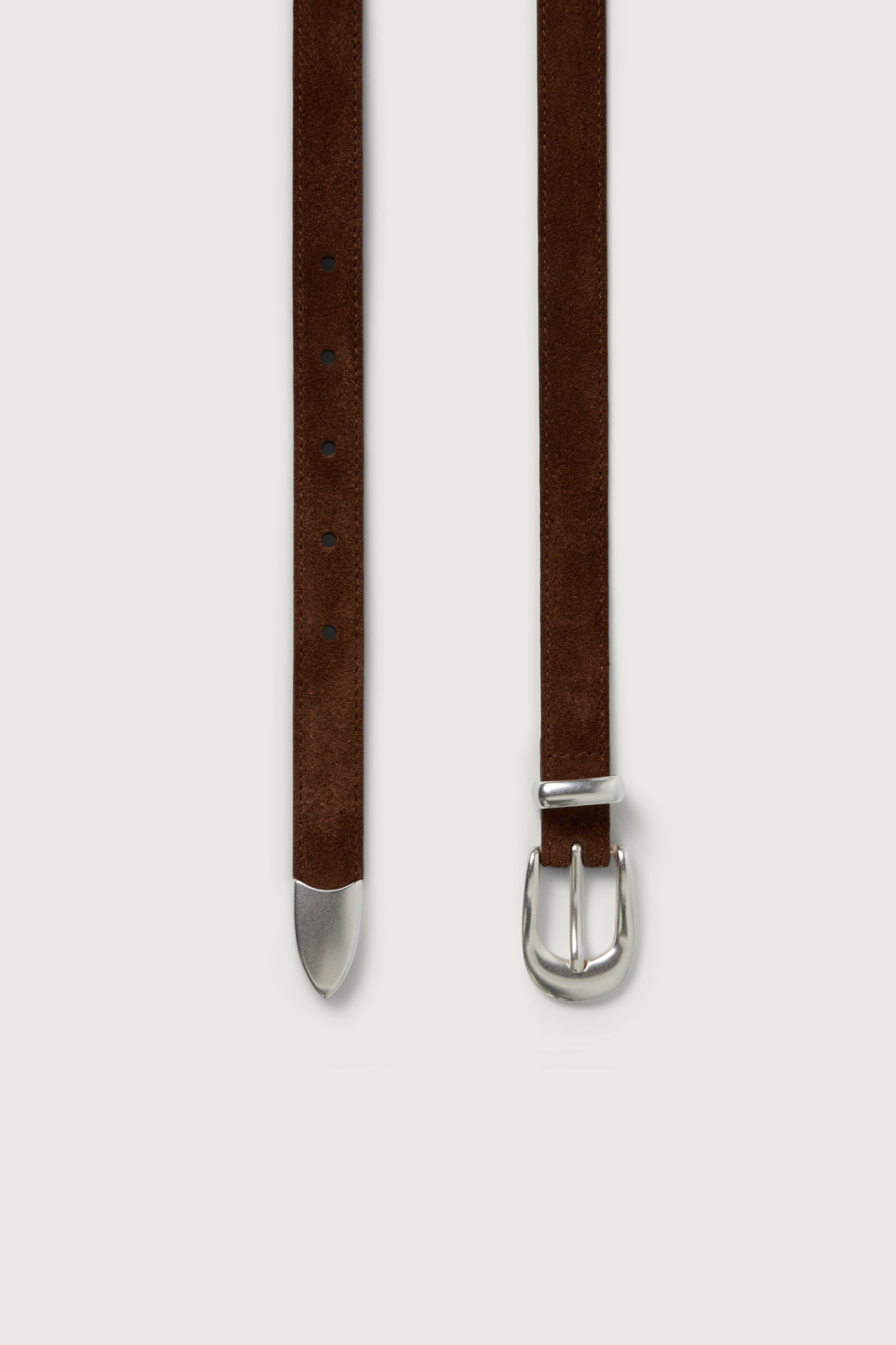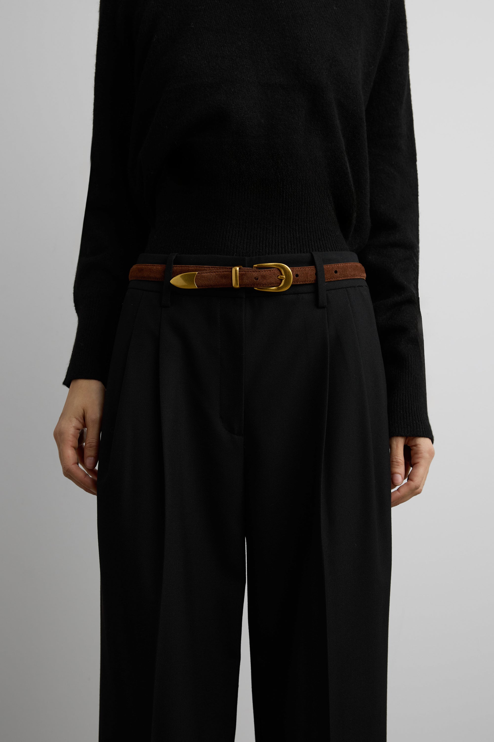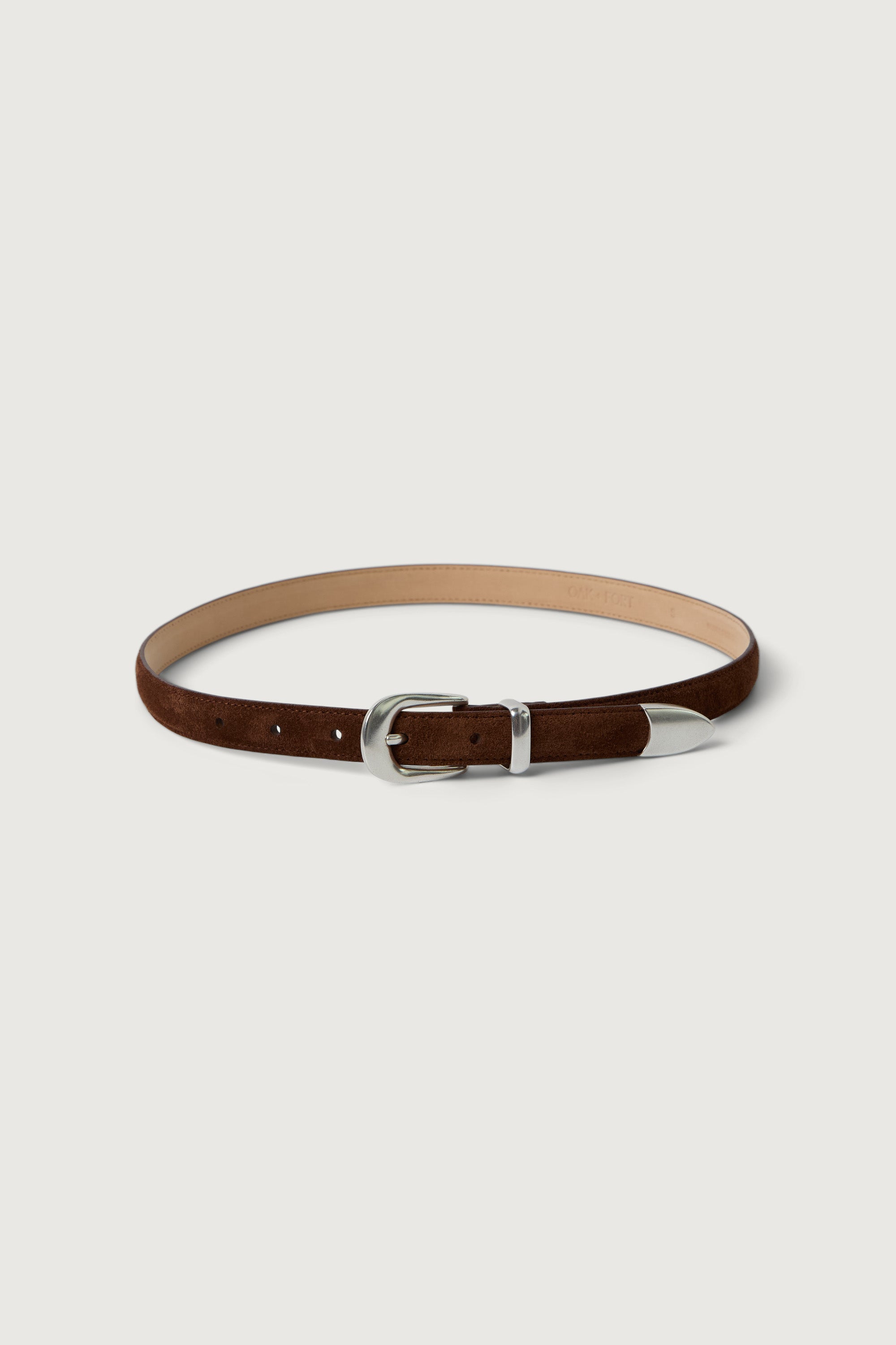 A classic suede belt with a softly textured finish and antique metal hardware. Designed for versatility, it complements both casual and tailored looks, adding quiet structure and refinement to everyday styling.