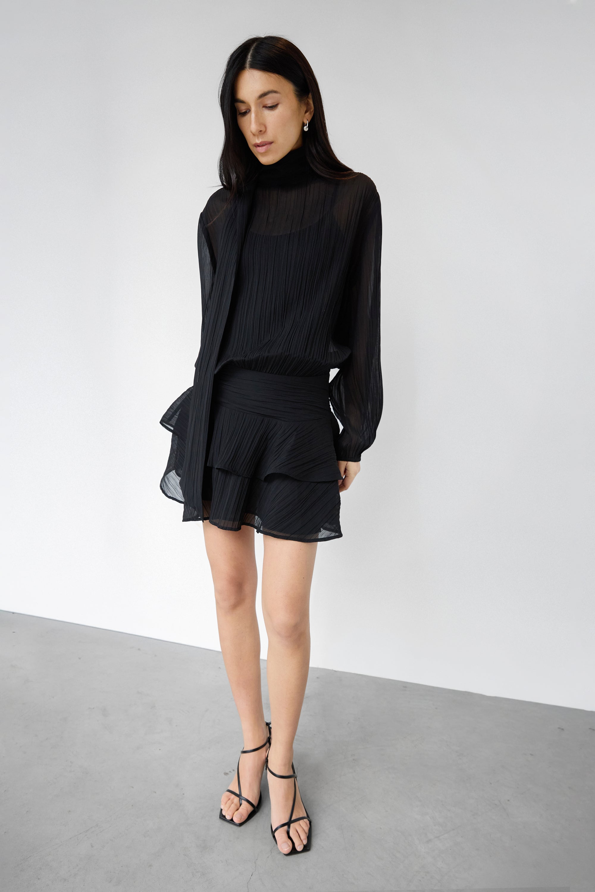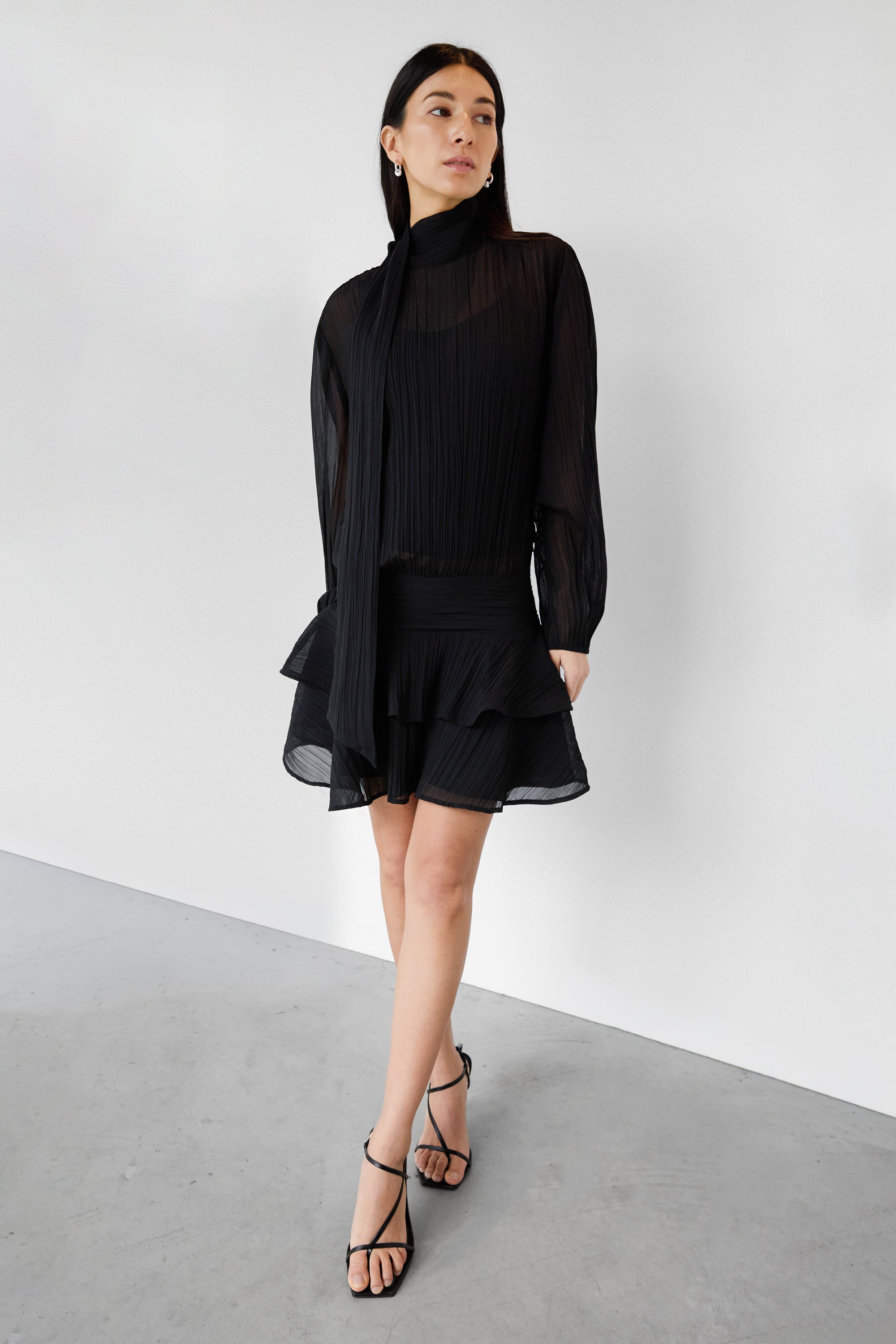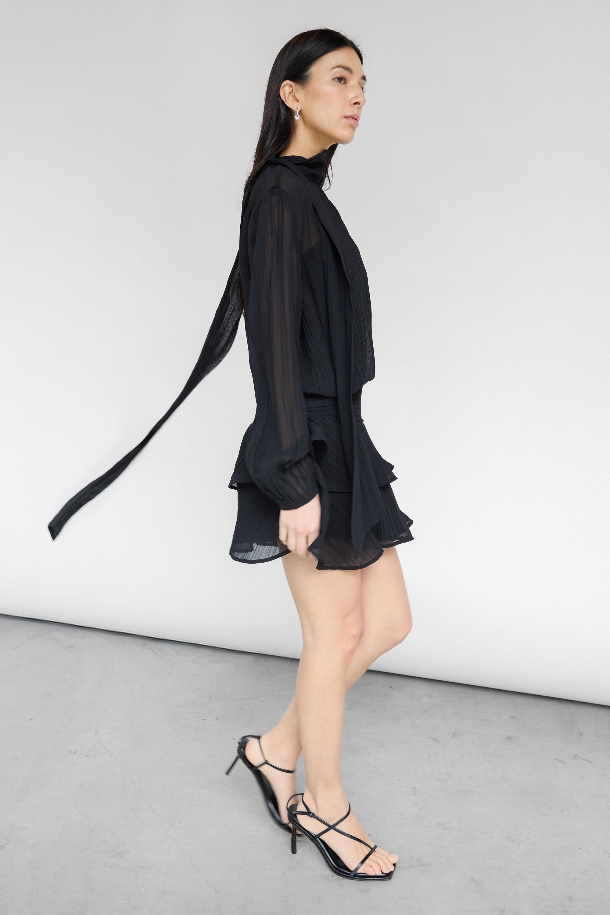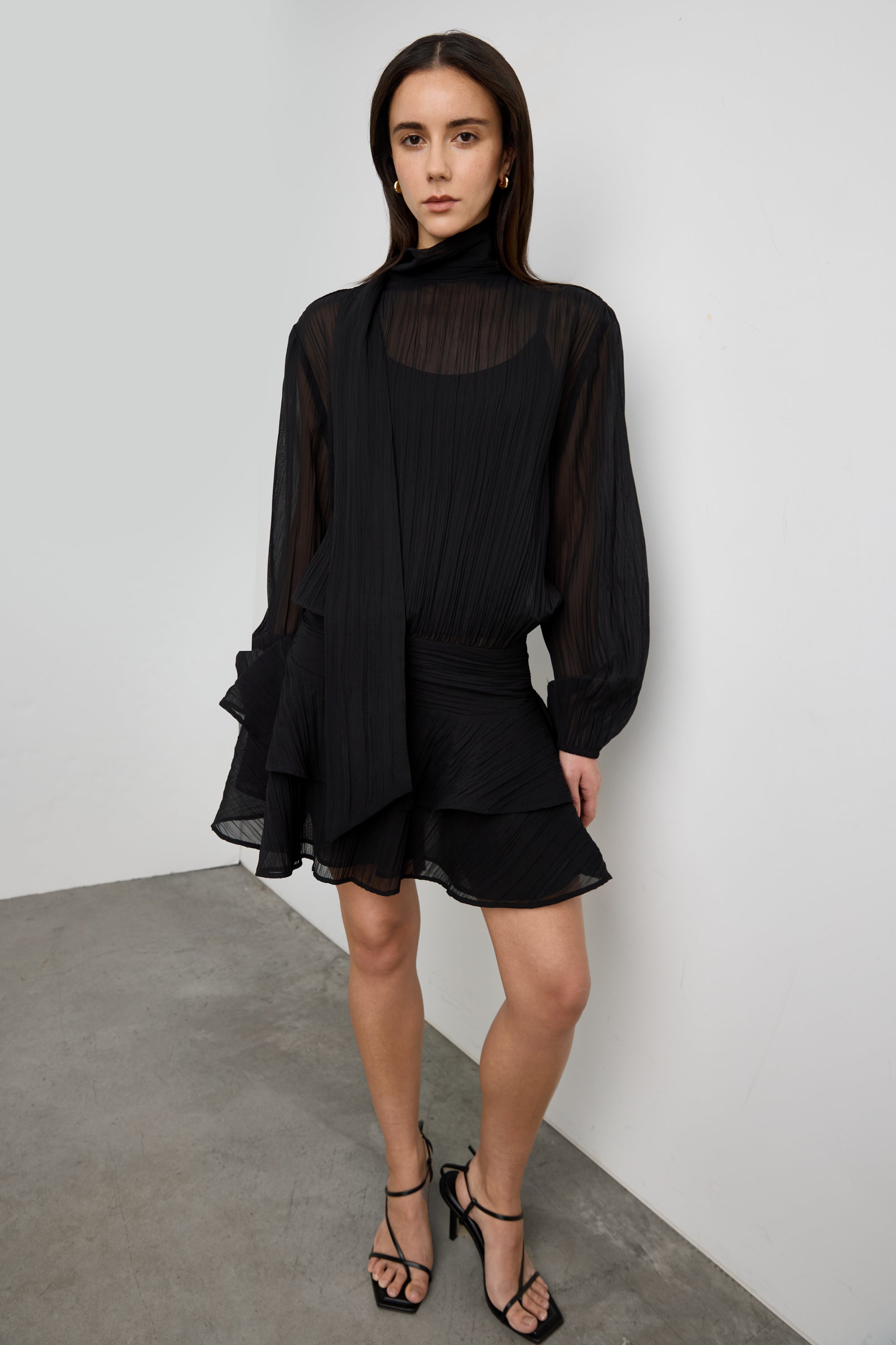 This mockneck mini dress is made from a sheer fabric and is detailed with balloon sleeves, a ruffled skirt and a neck tie. Flirty and romantic and perfect for your next occasion. Pair yours with strappy heels.