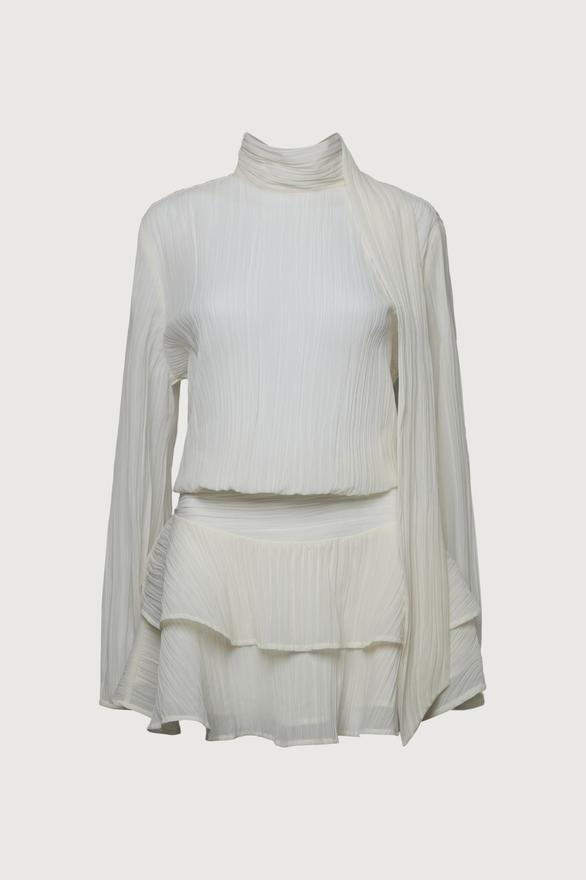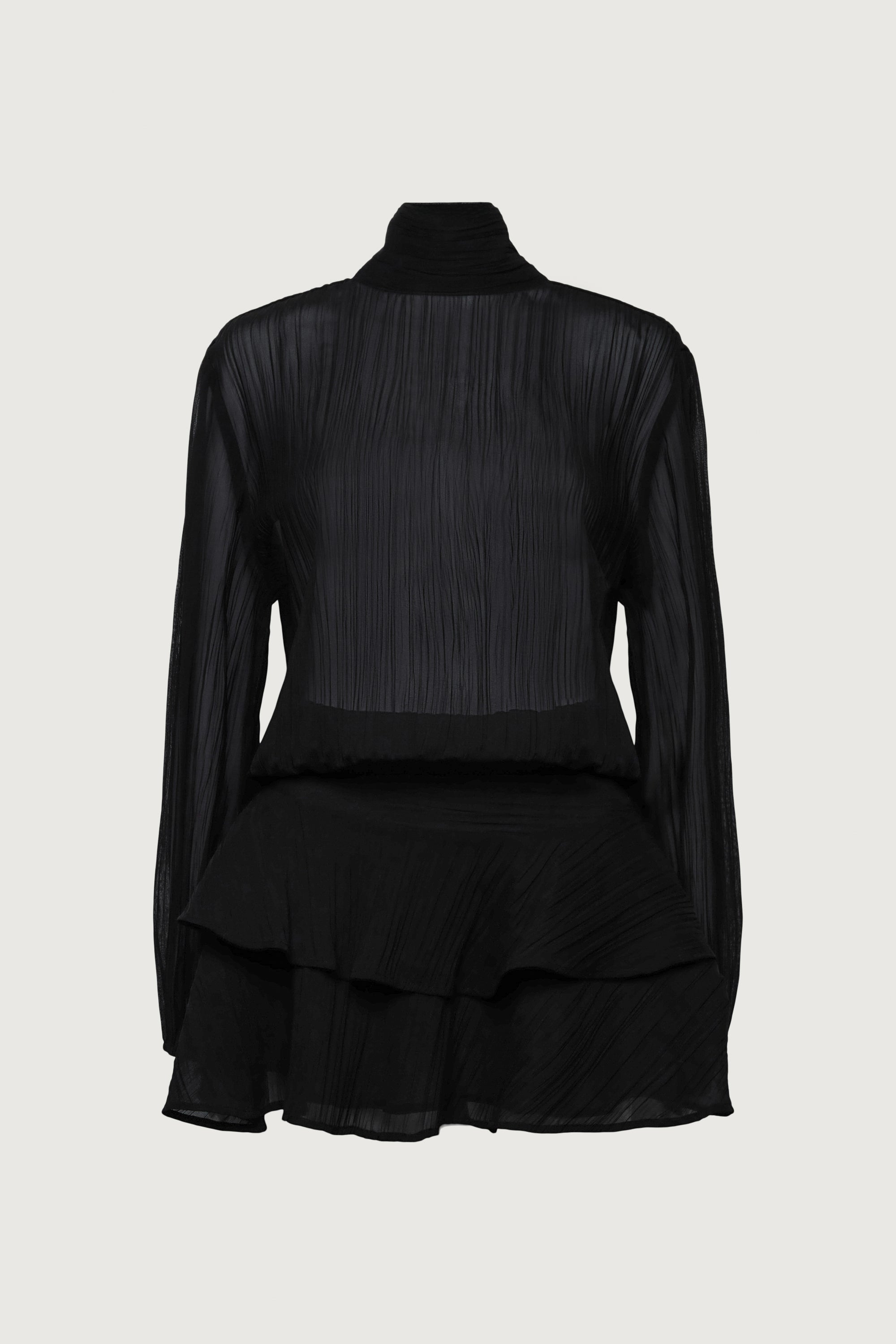 Sheer fabric. Mock neckline with ties. Balloon sleeves with elasticated cuffs. Ruffled, lined skirt. Invisible zipper. Keyhole closure at the back.