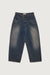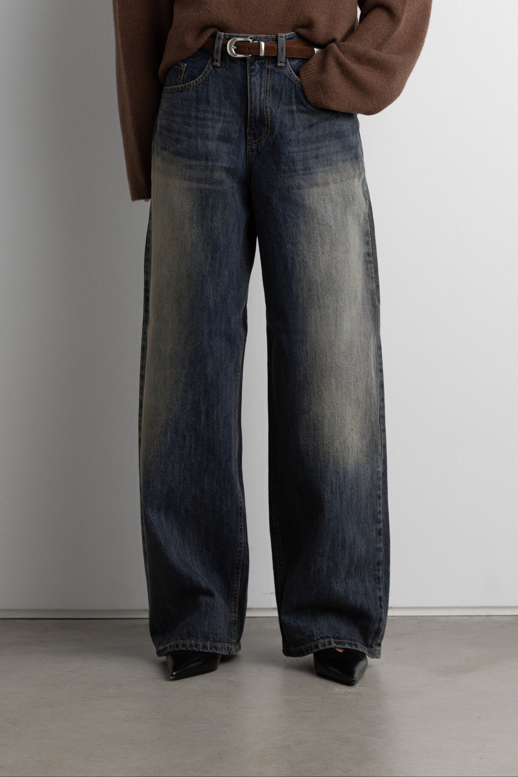 These dark wash jeans are made from a mid-weight, non-stretch denim. It's made for a baggy, relaxed look with a subtle curved silhouette. It's detailed with whiskering and fading down the leg for a vintage, lived in look and is complete with a side and back pockets.
