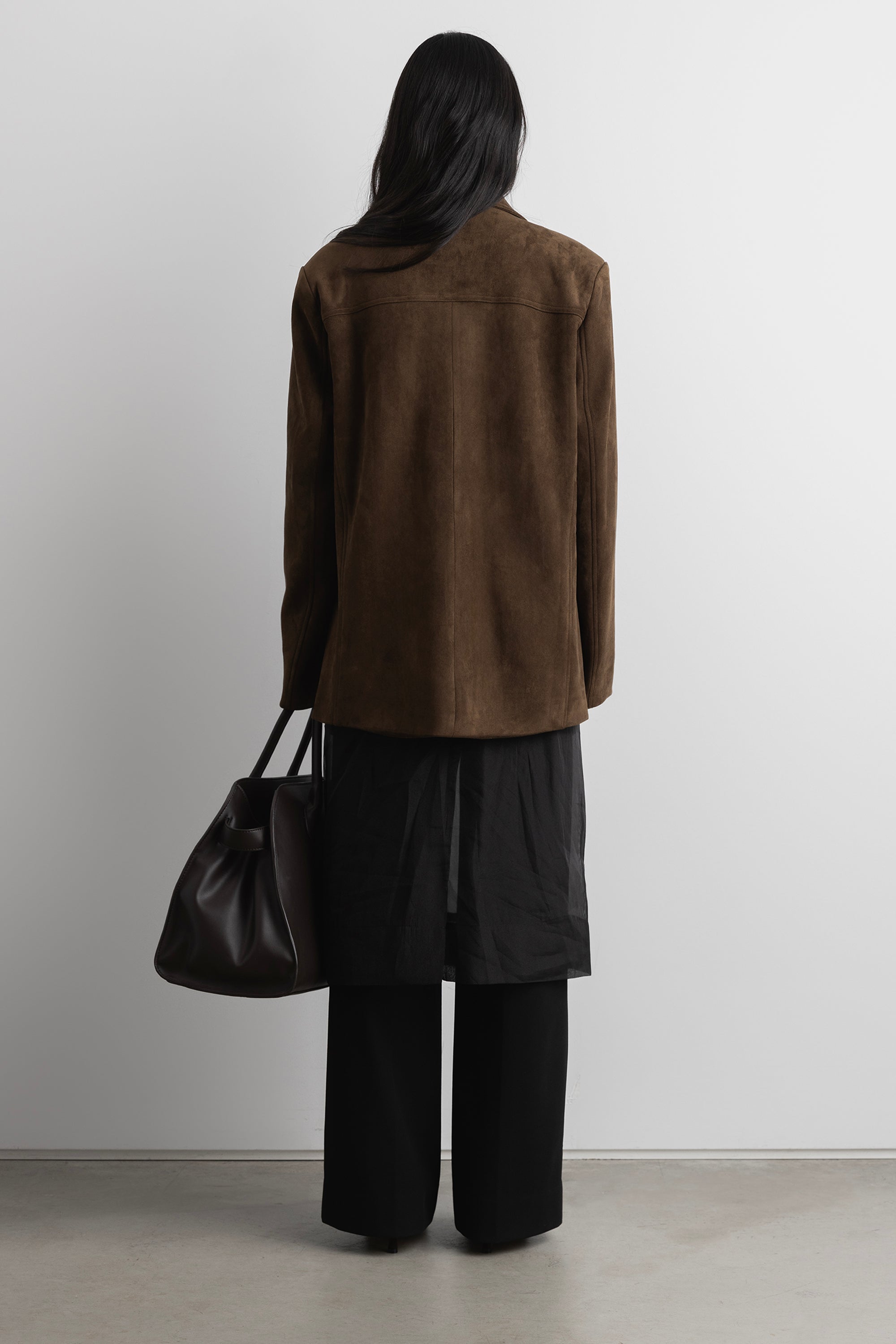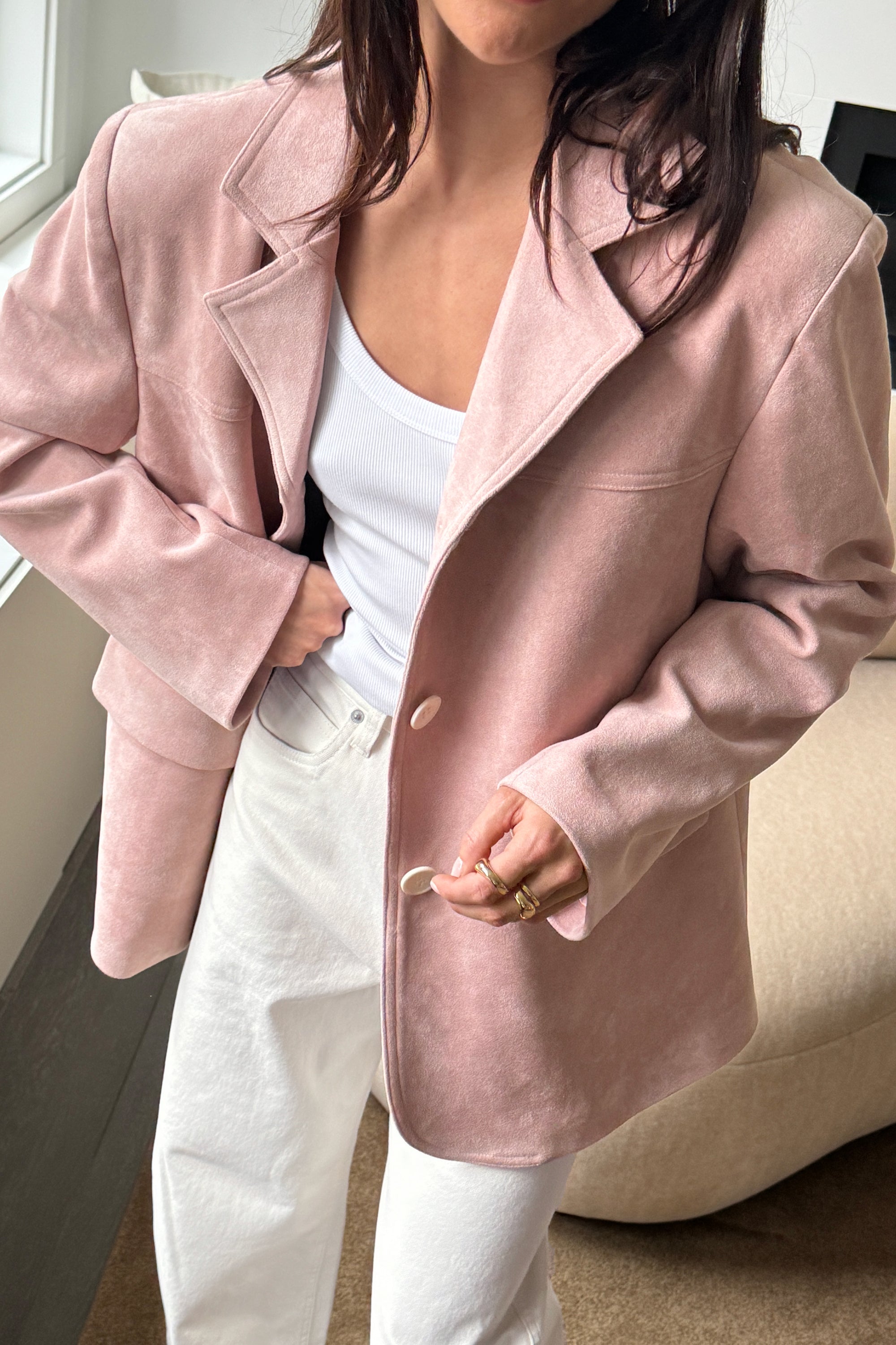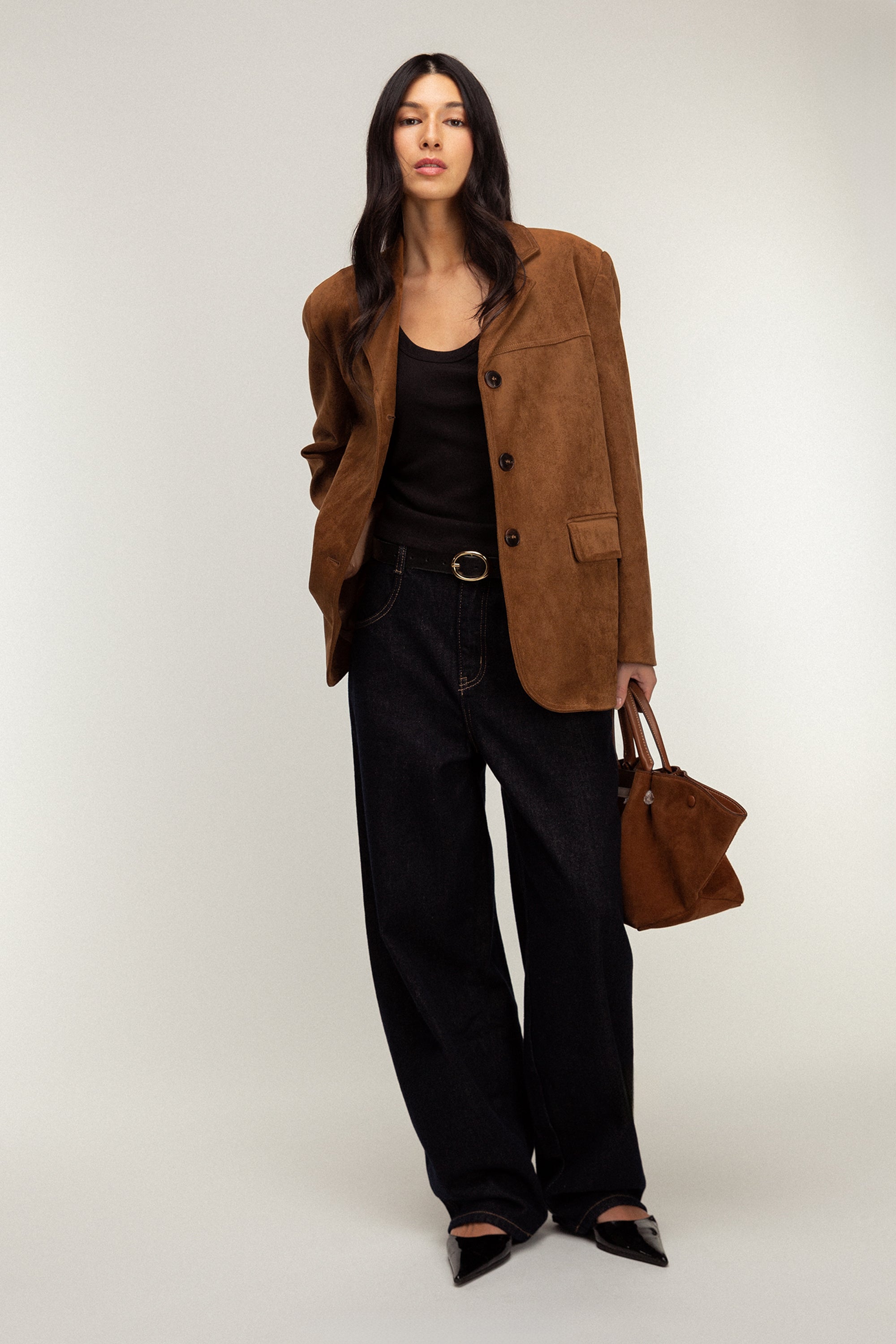 This vegan suede blazer comes in an oversized fit. Wear this versatile blazer this autumn season over trousers, or dress it up by styling it over a midi skirt.