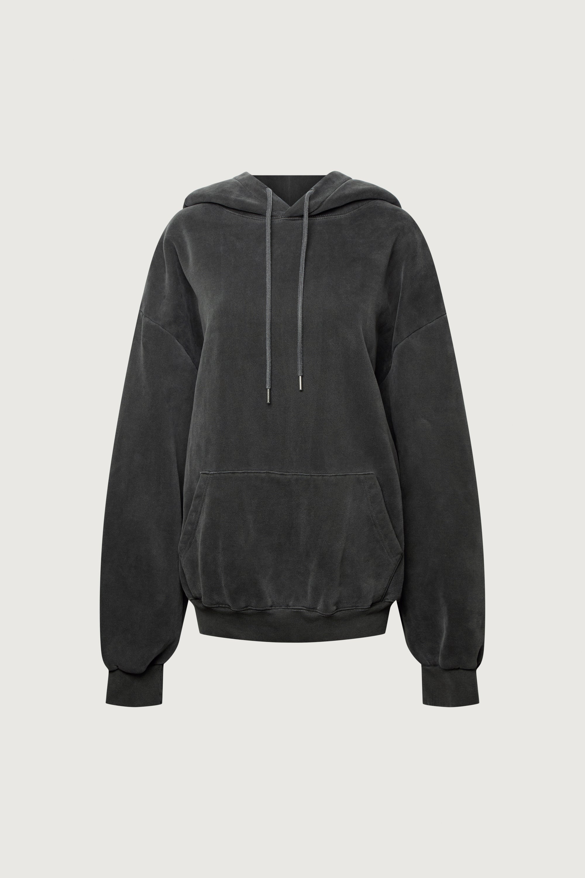 Vintage wash. Heavy weight cotton blend. Drawstring hood. Kangaroo front pouch pocket. Dropped shoulders. Ribbed trims.
