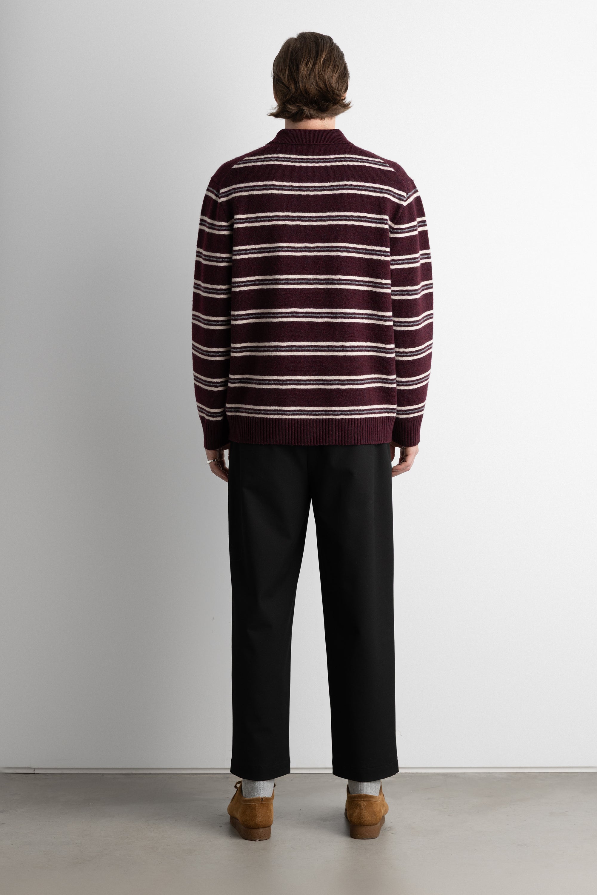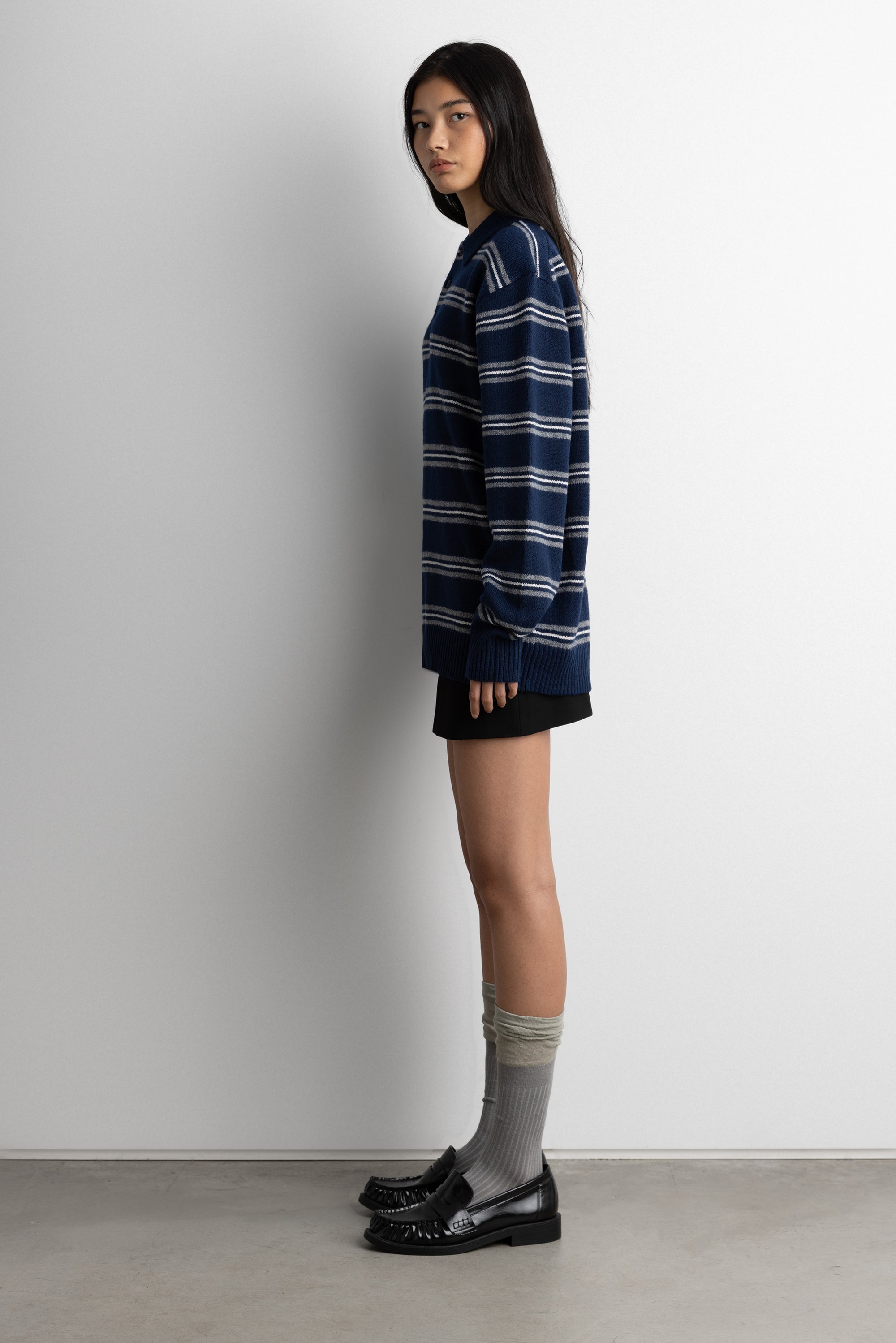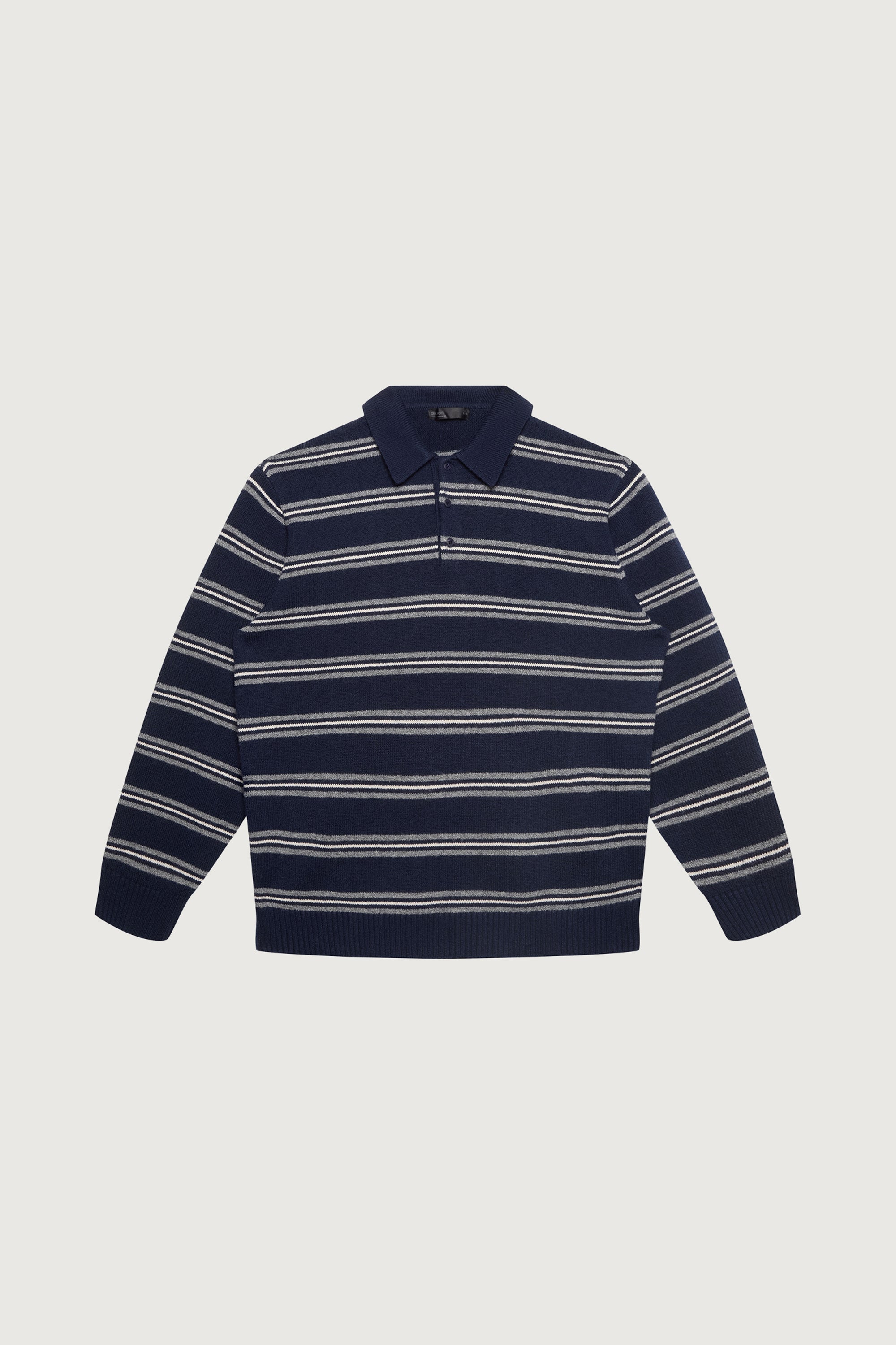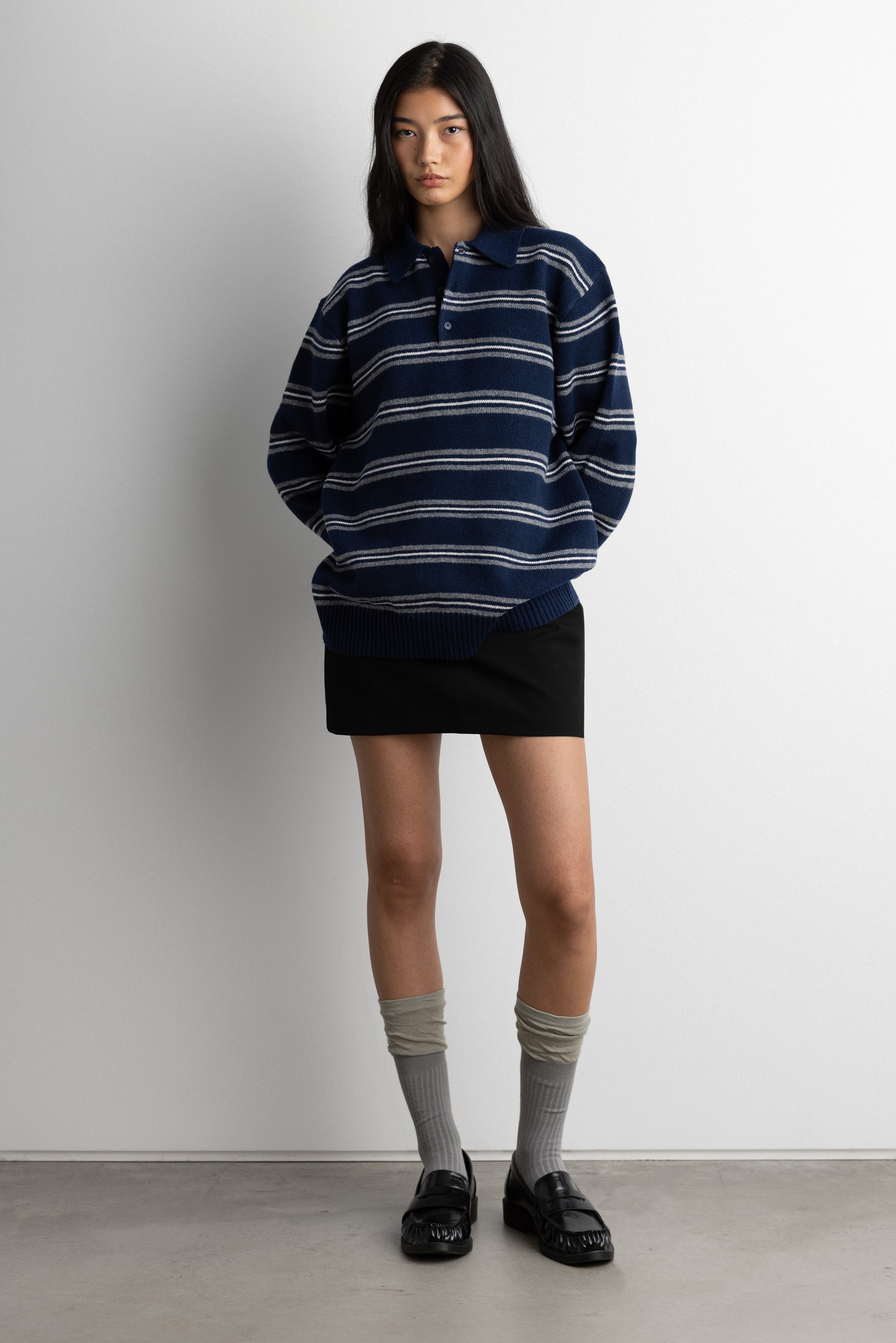 Relaxed fit. Recycled poly blend stretch fabric. Striped design. Collar. Embedded placket. Quarter button up with mother of pearl buttons. 28” based on size M.