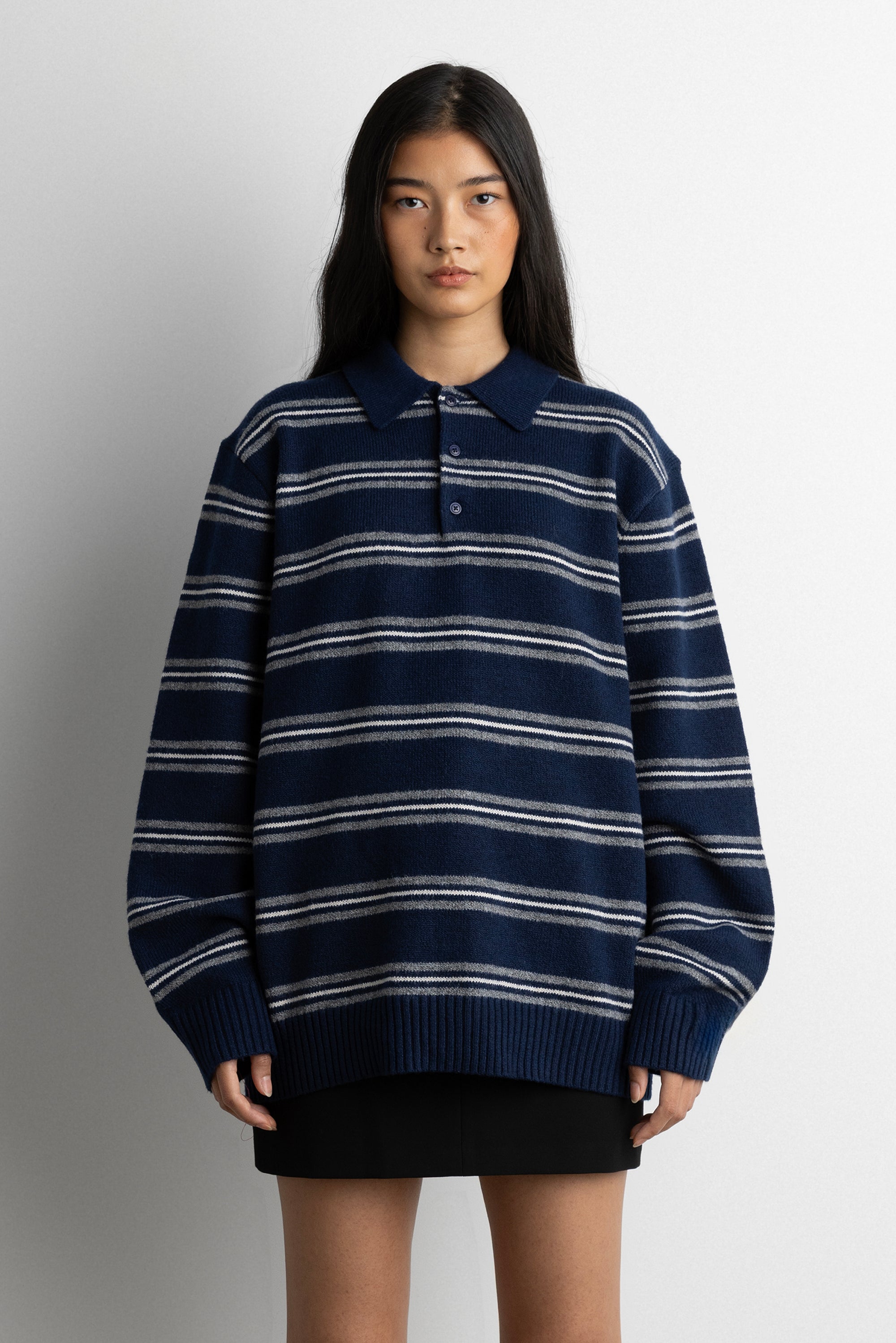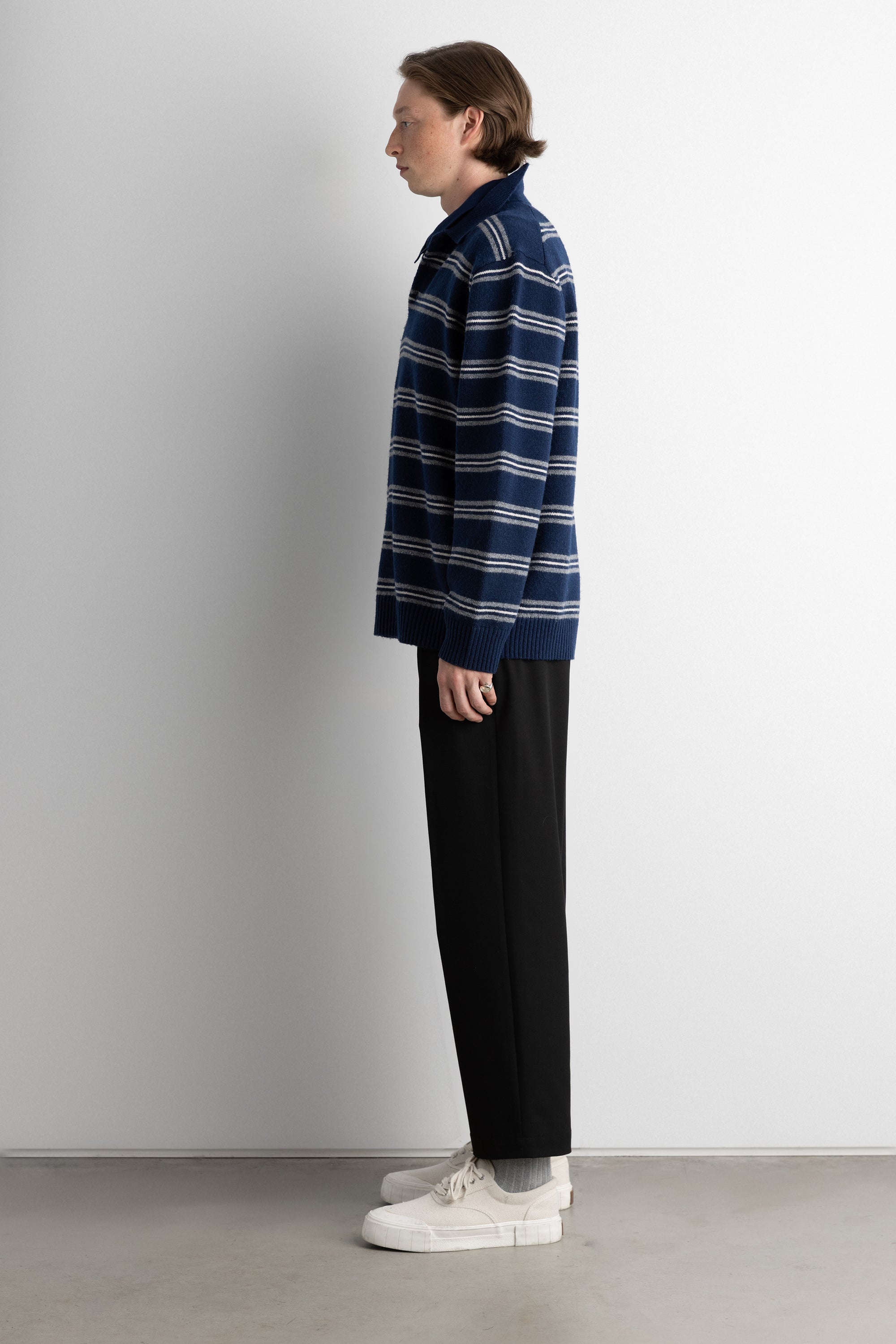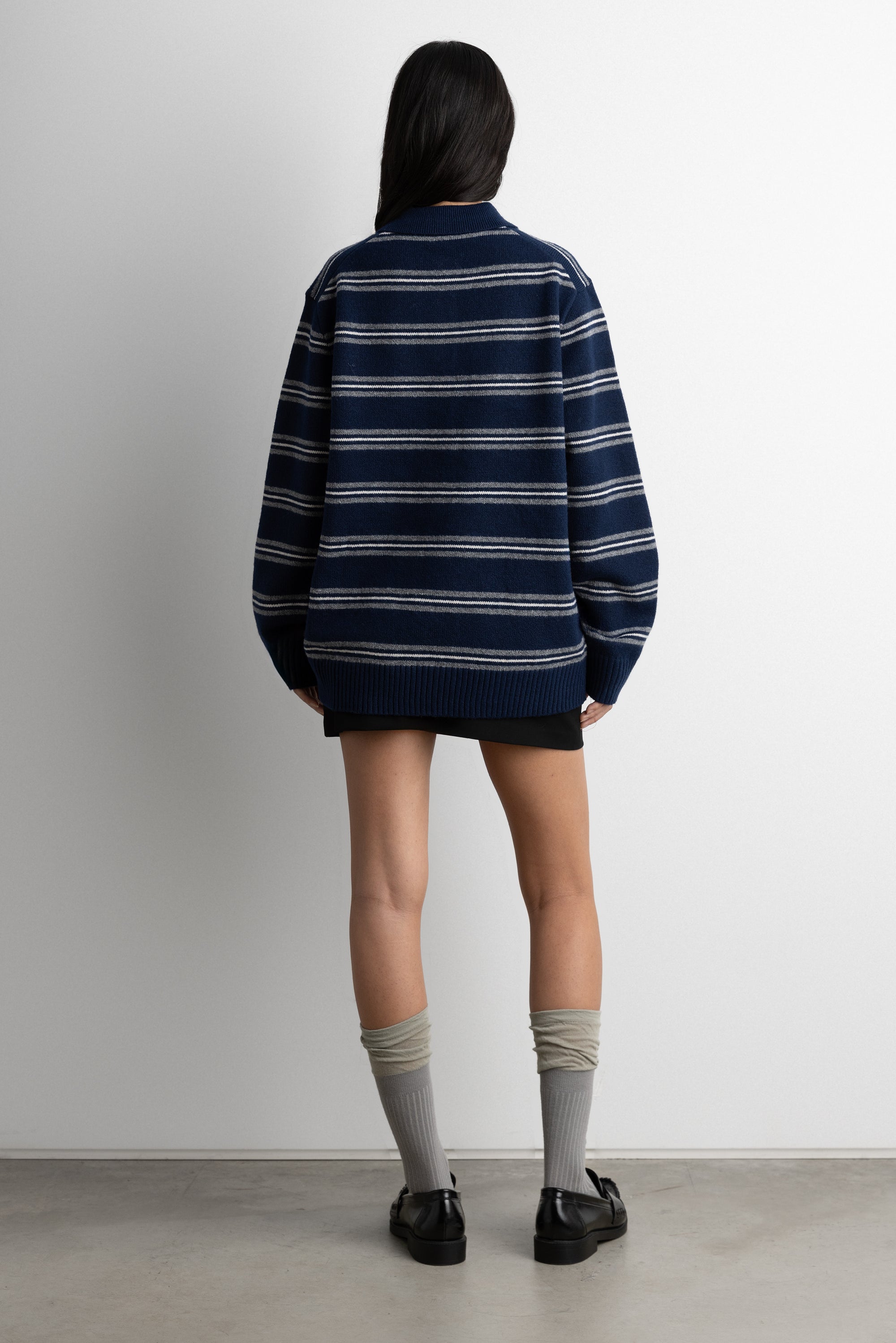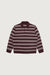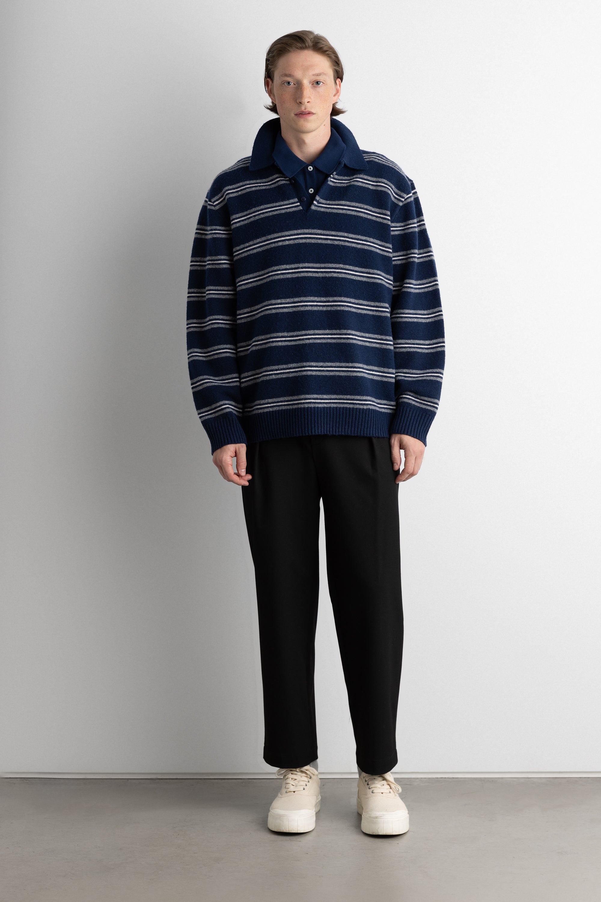 Relaxed fit. Recycled poly blend stretch fabric. Striped design. Collar. Embedded placket. Quarter button up with mother of pearl buttons. 28” based on size M.