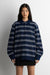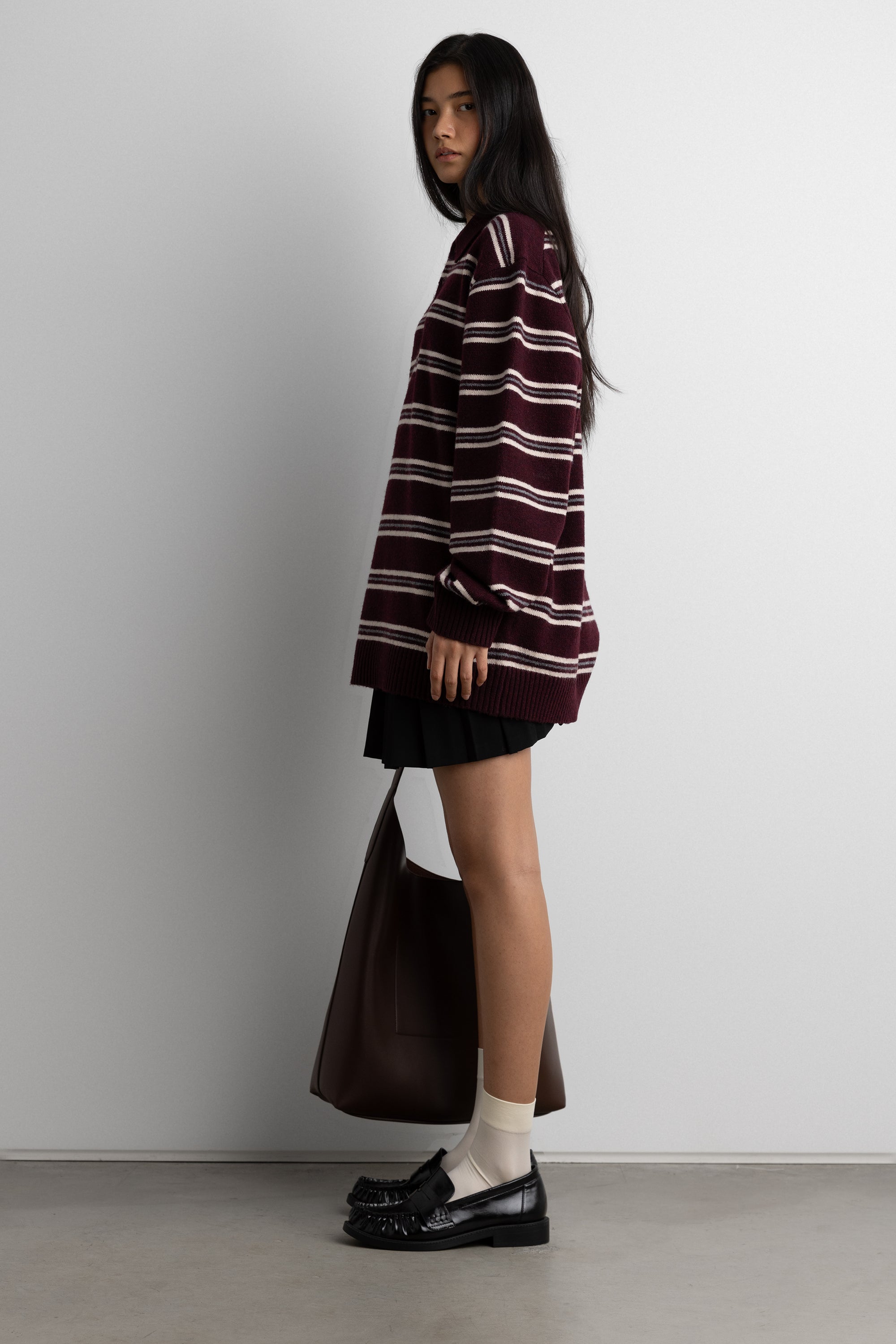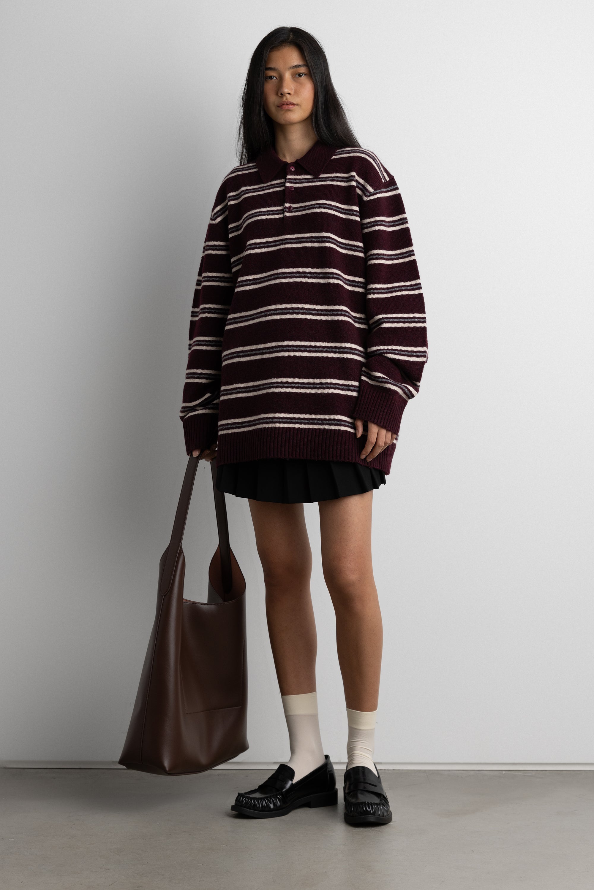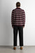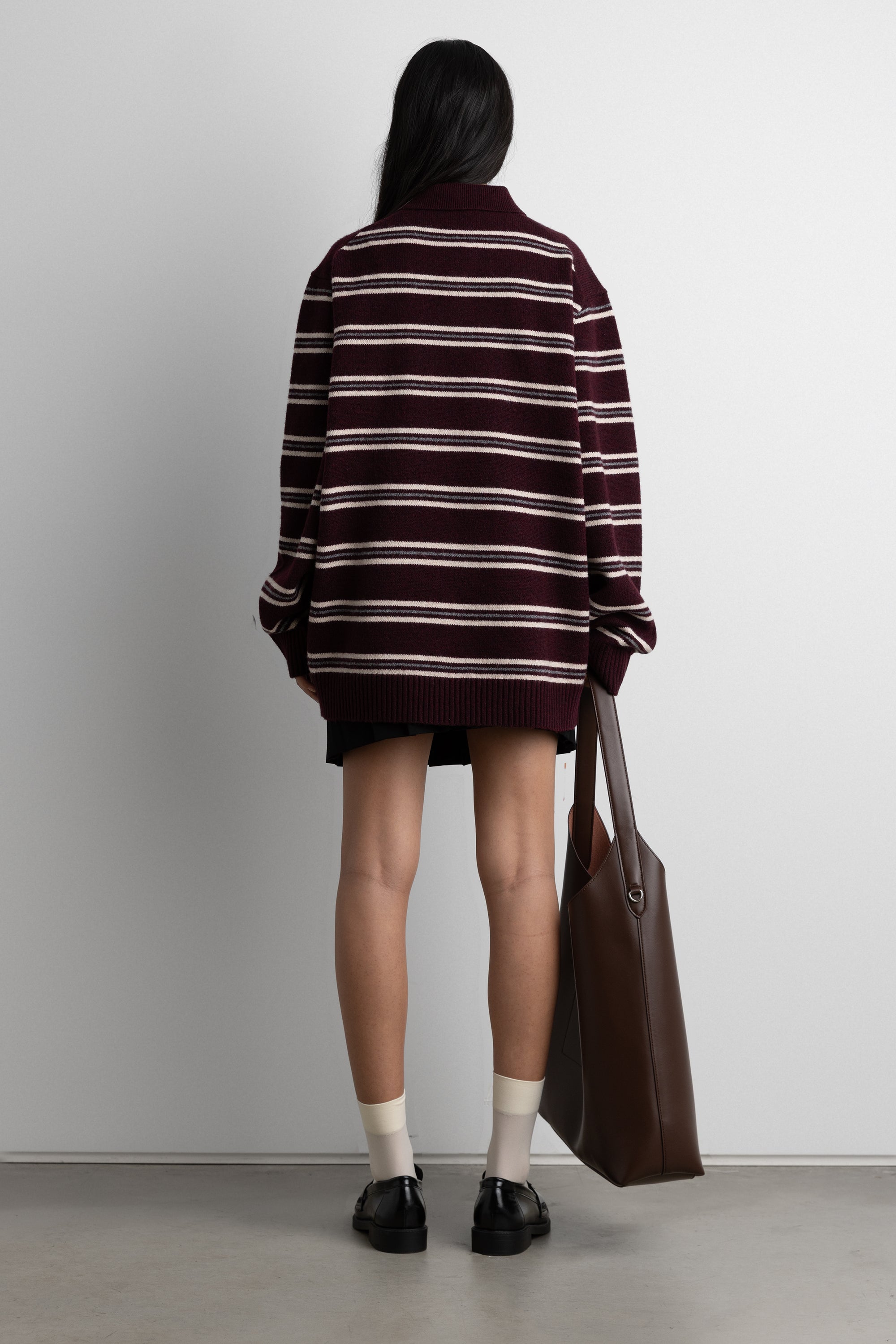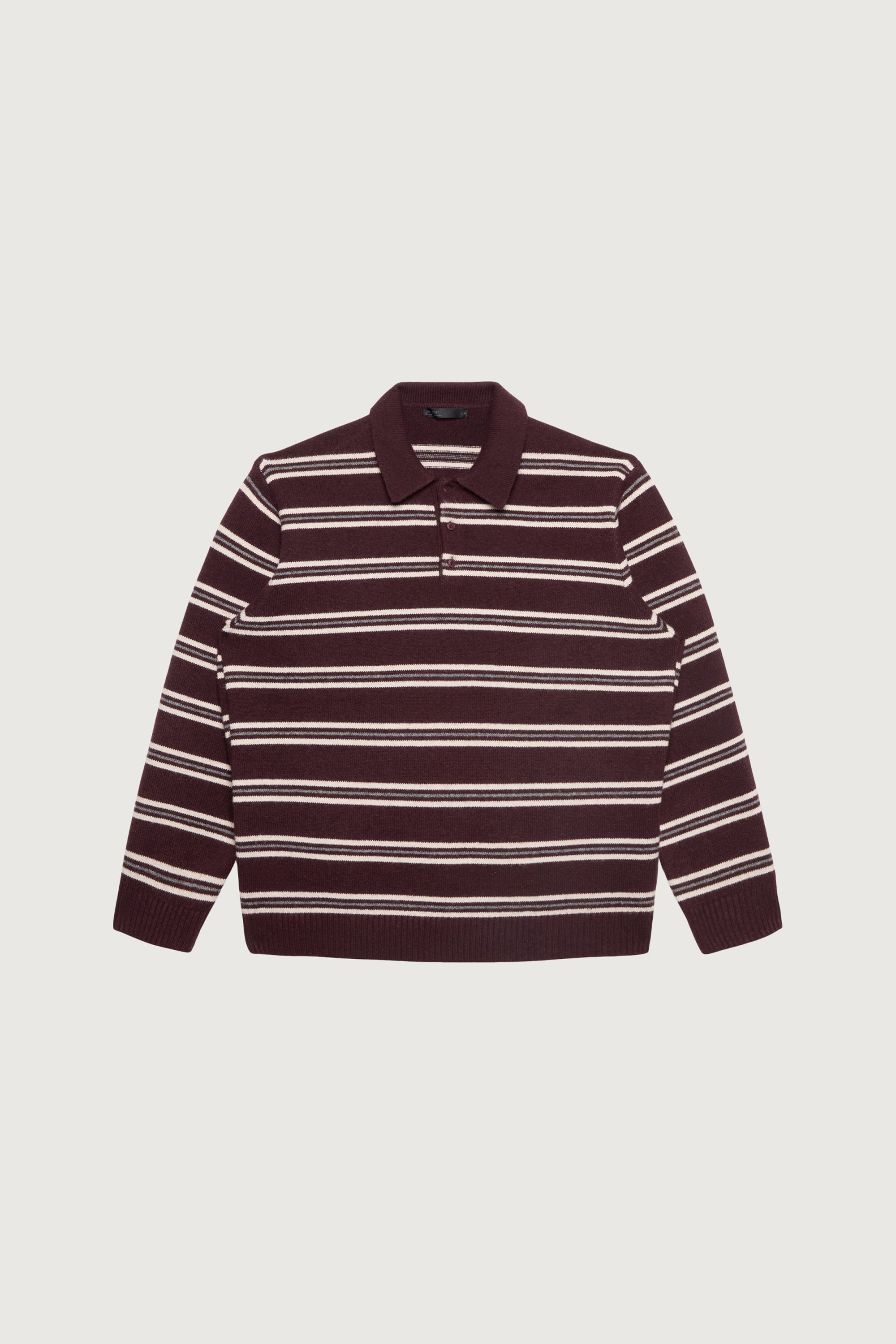 Relaxed fit. Recycled poly blend stretch fabric. Striped design. Collar. Embedded placket. Quarter button up with mother of pearl buttons. 28” based on size M.