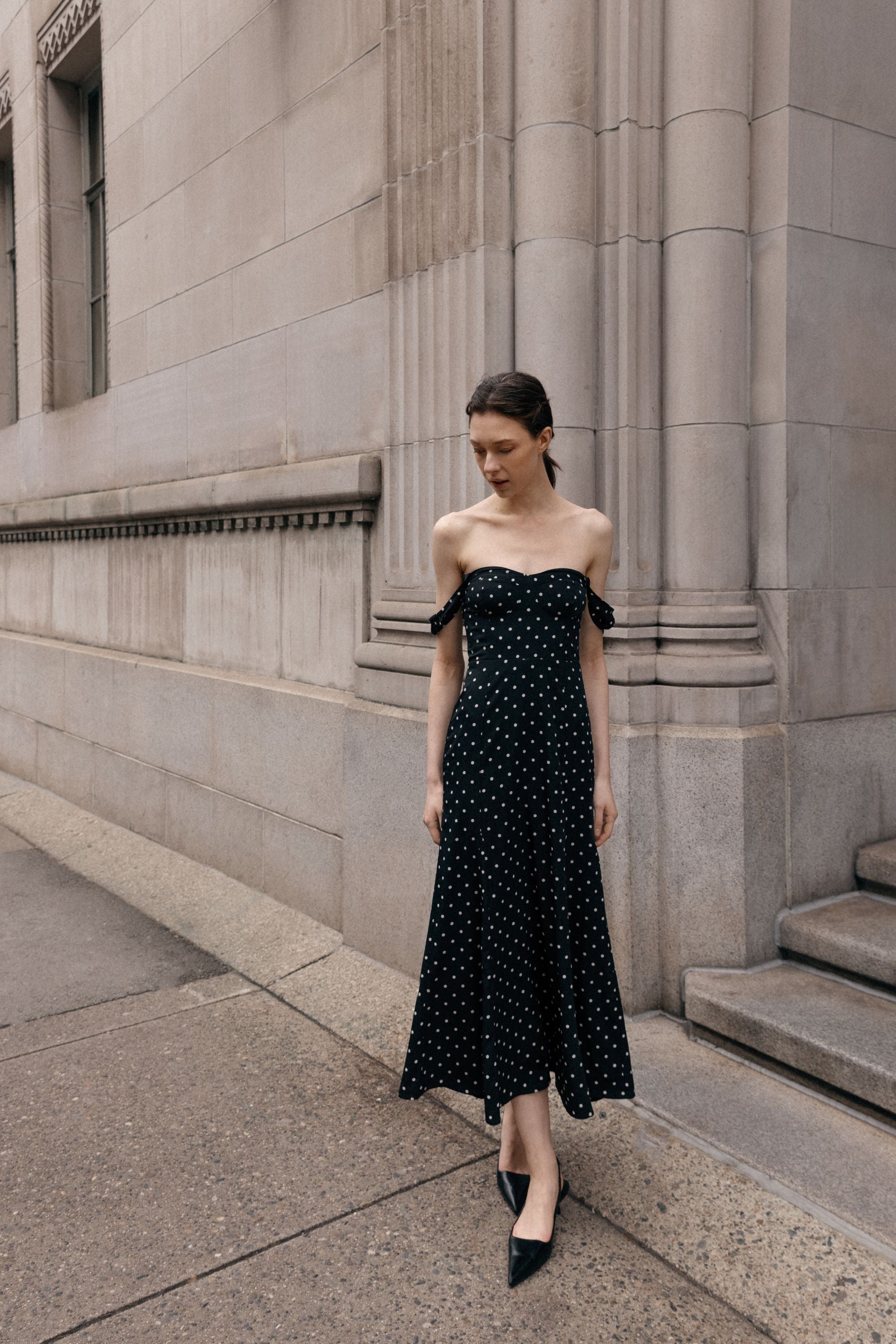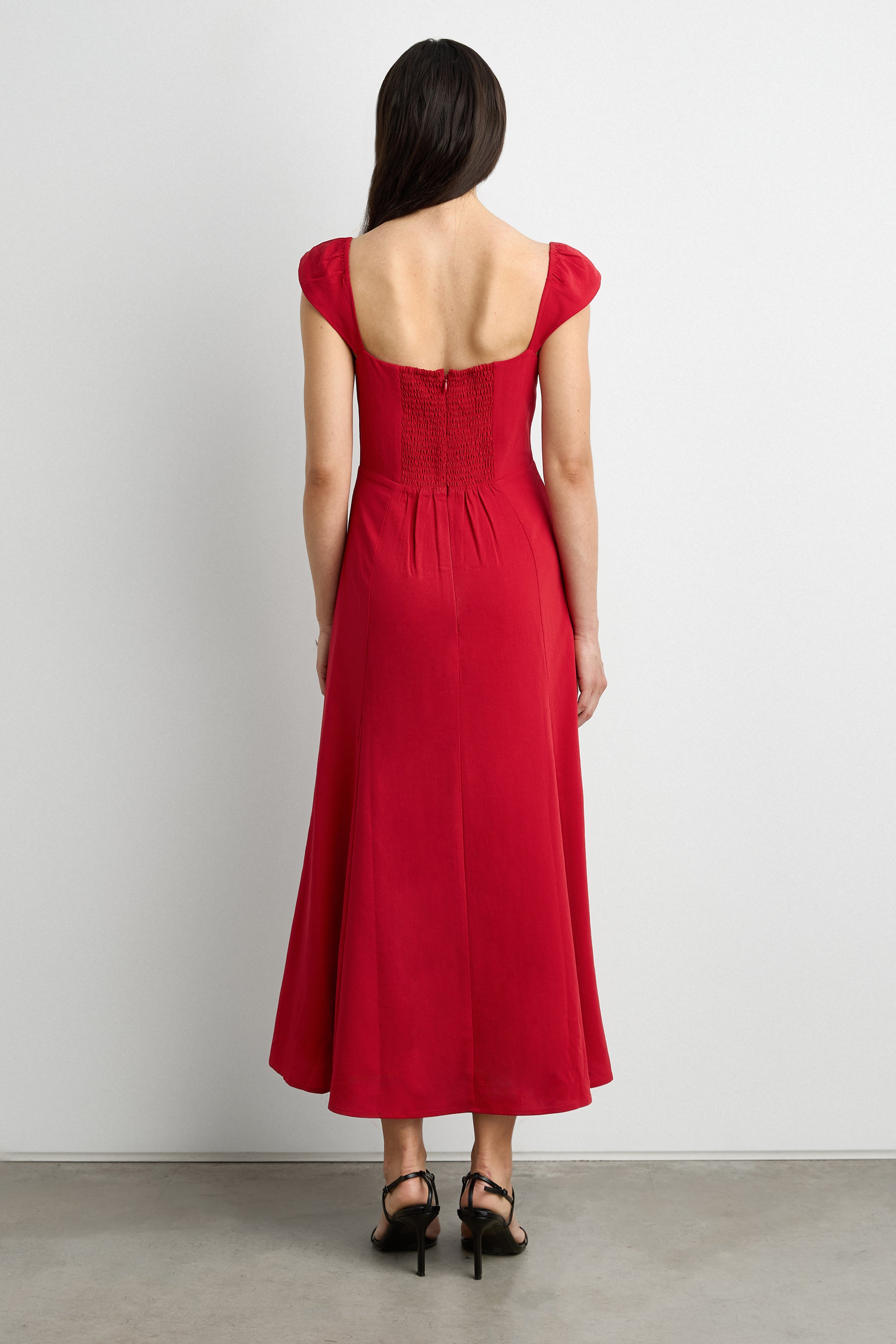 This corset midi dress is made in from a lightweight crepe fabric in a slim fit. It has a flirty sweetheart neckline, cap sleeves, a smocked back and a subtle a-line skirt for added movement. The perfect dress to wear from day to night this season and the next.