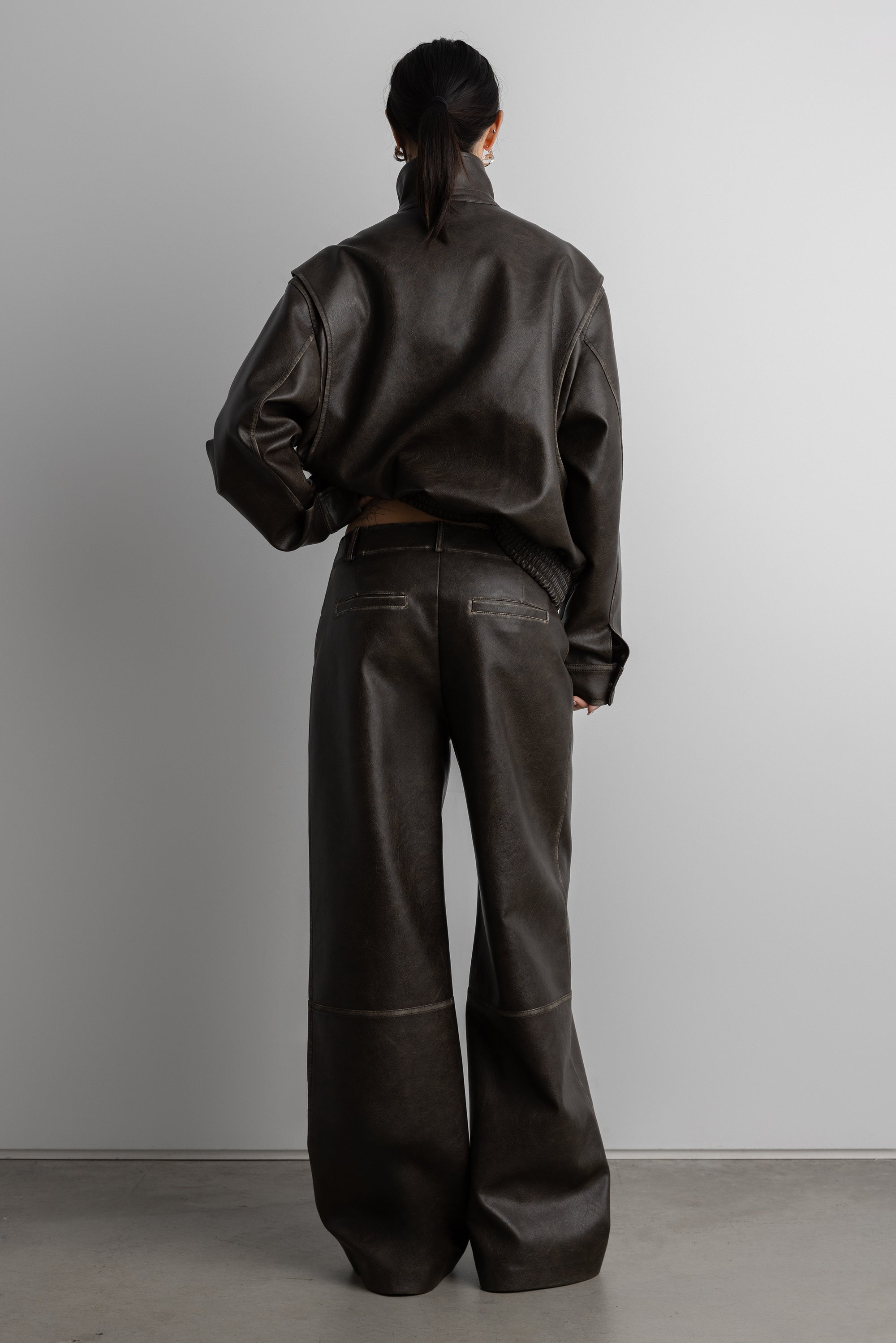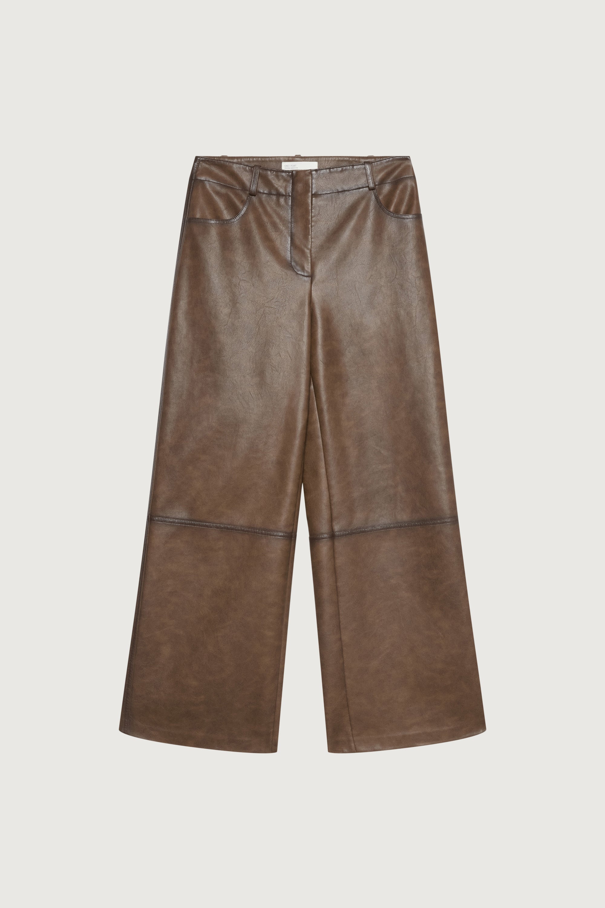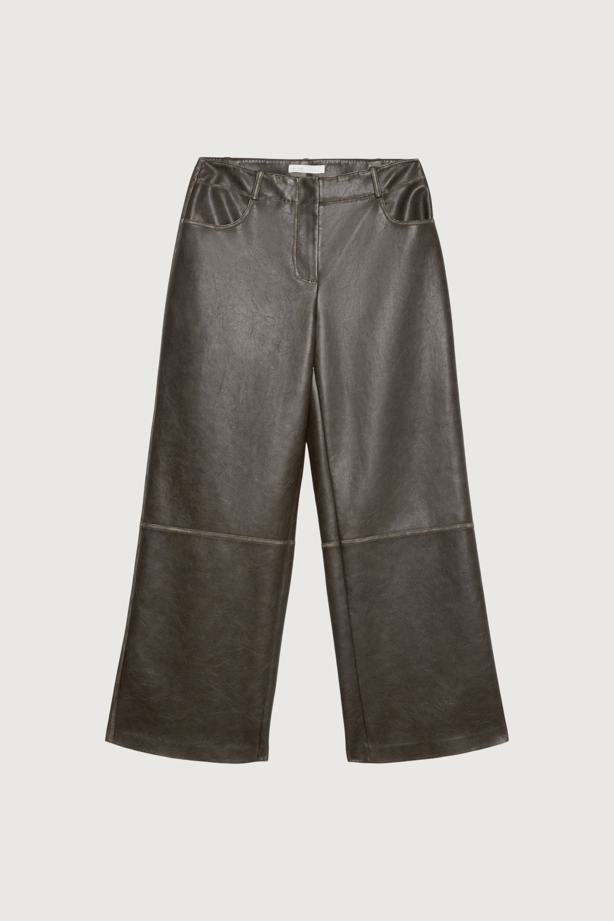 These vegan leather straight leg pants are made in a classic fit and has a mid-rise waist. It's paneled with distressed seams and is lined for added comfort.