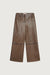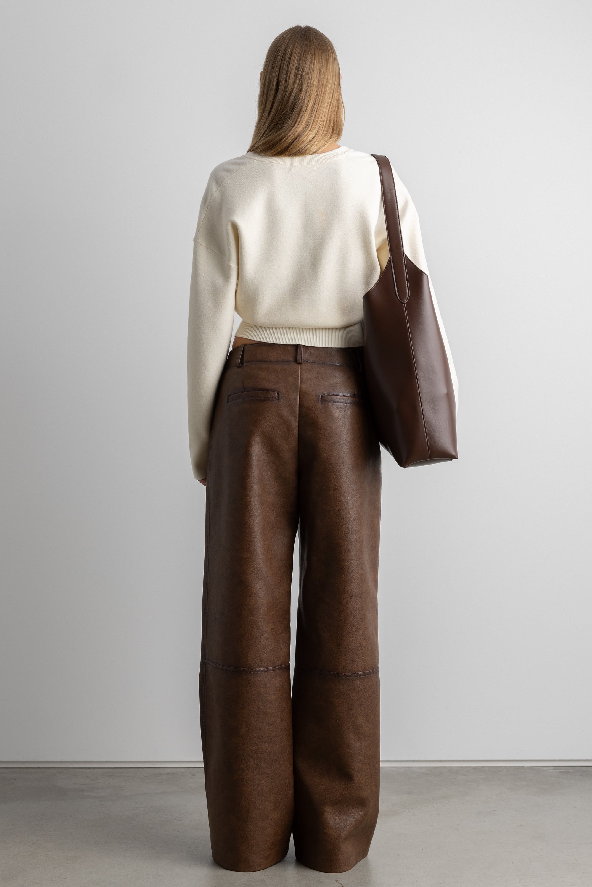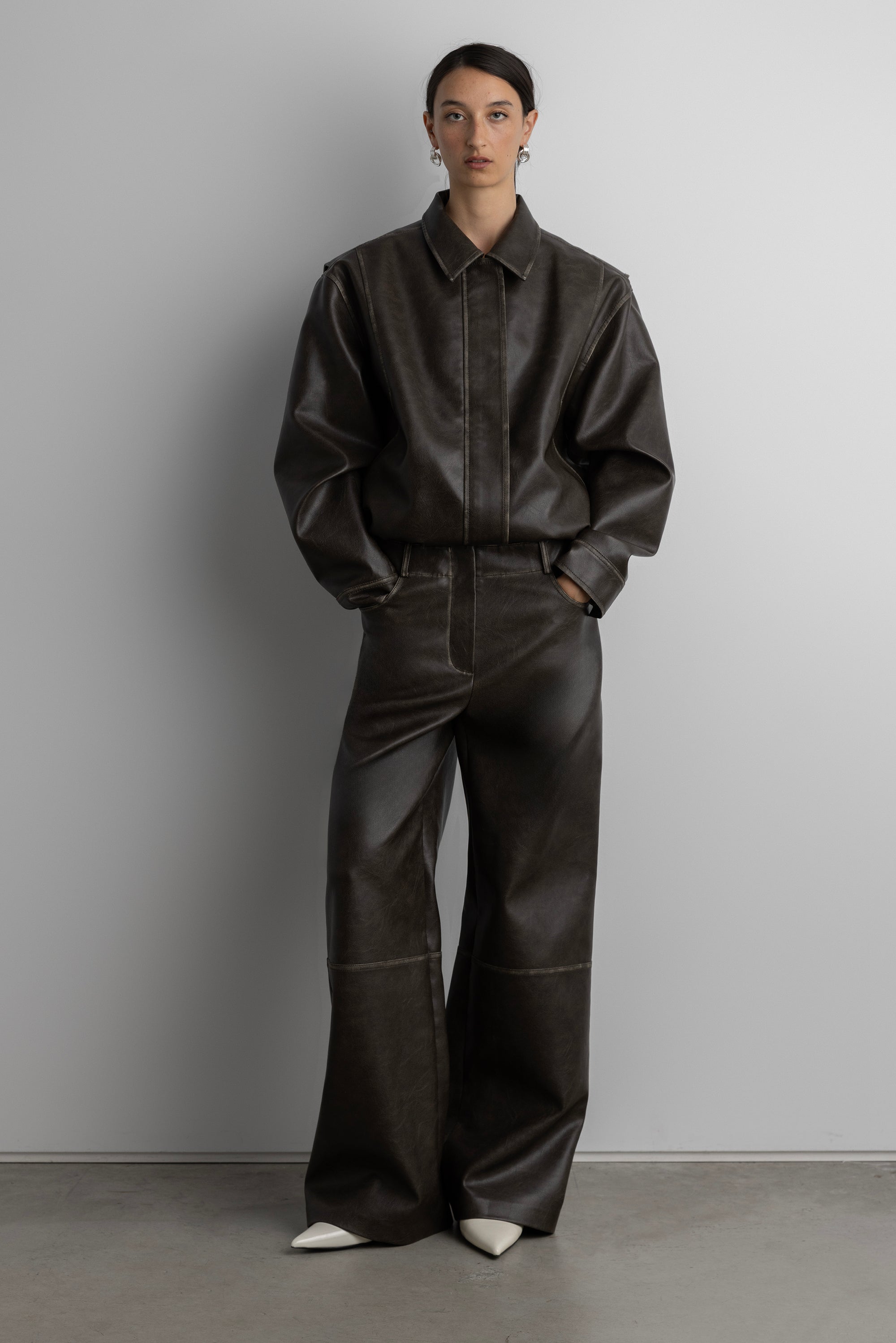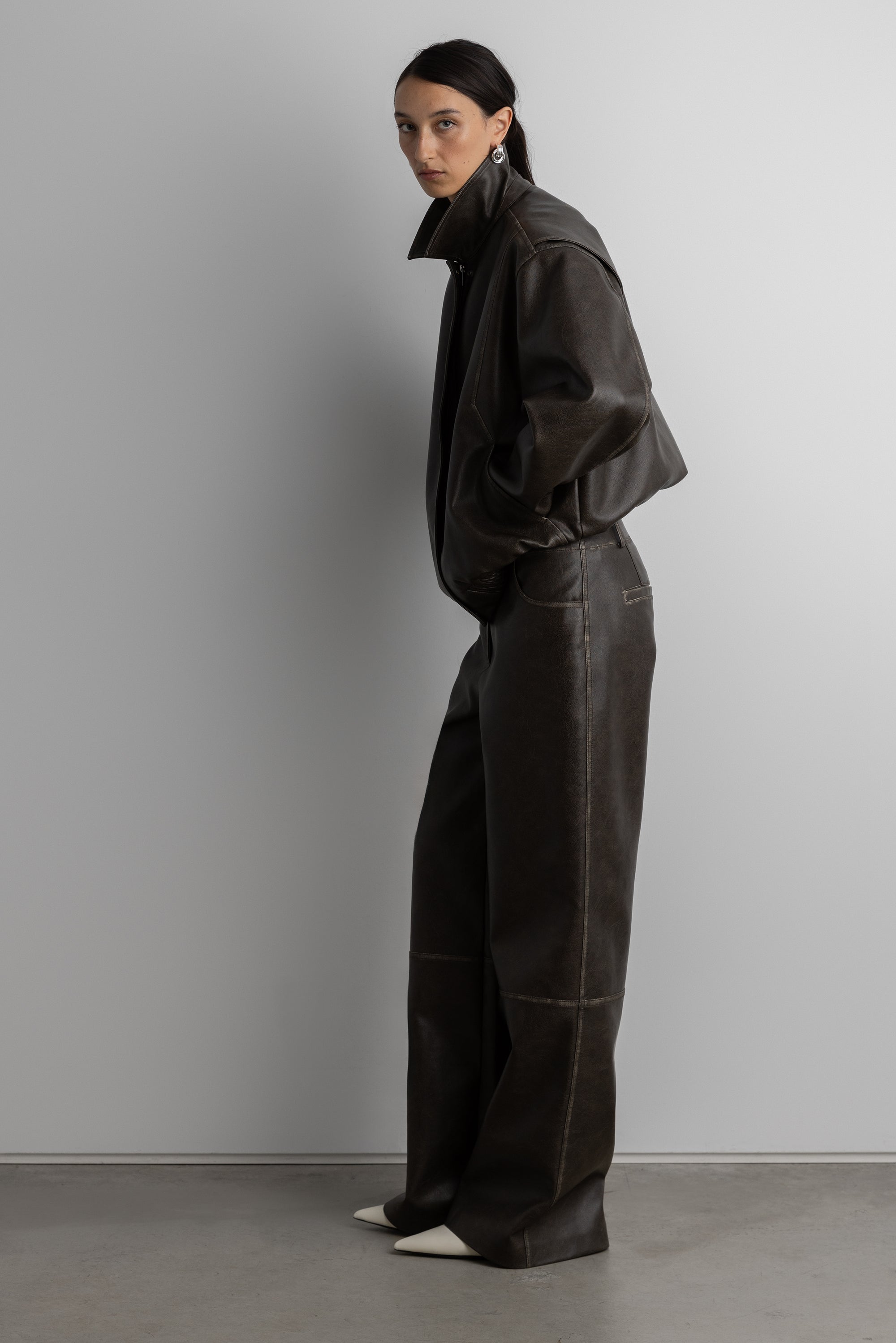 These vegan leather straight leg pants are made in a classic fit and has a mid-rise waist. It's paneled with distressed seams and is lined for added comfort.