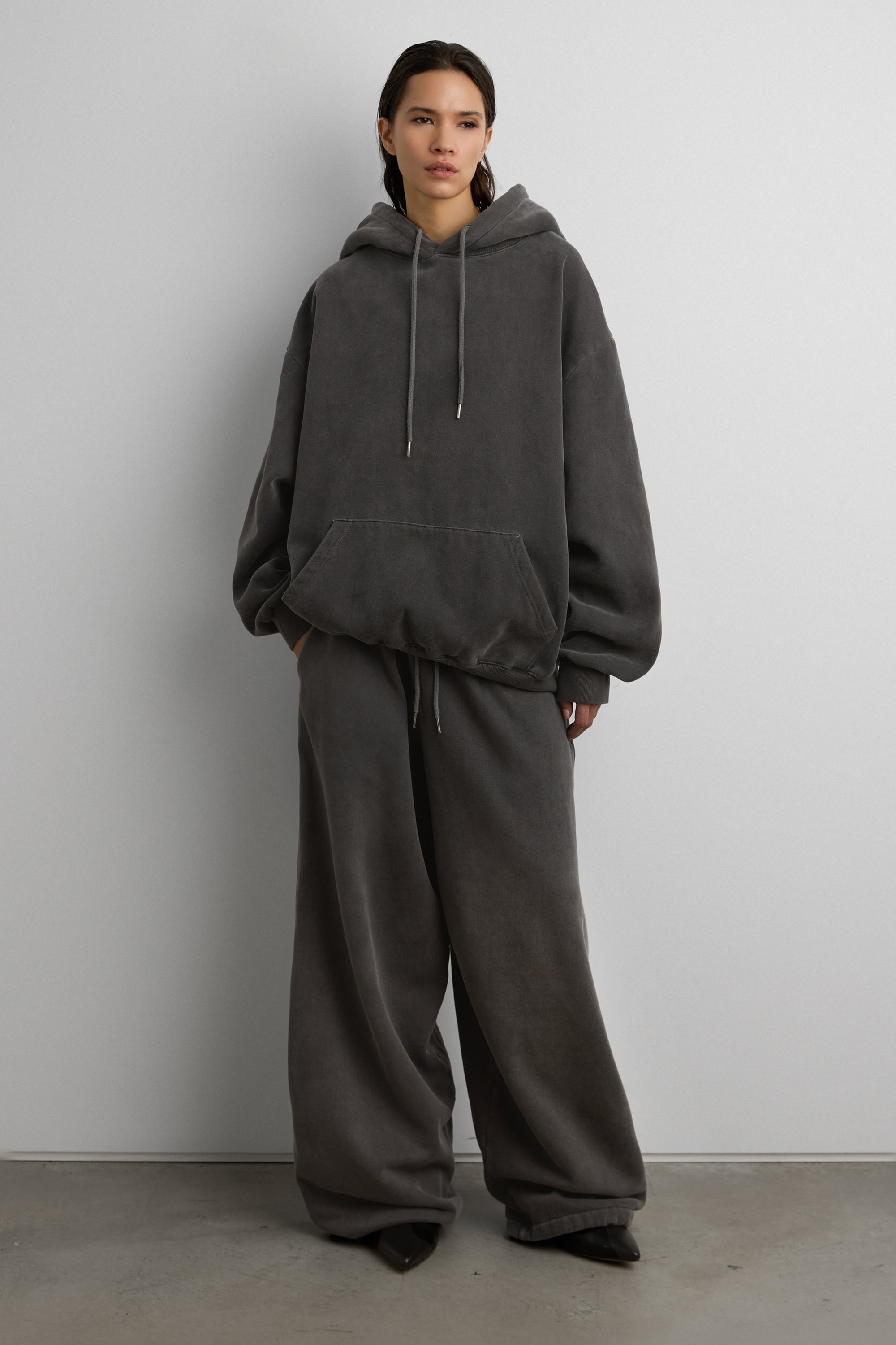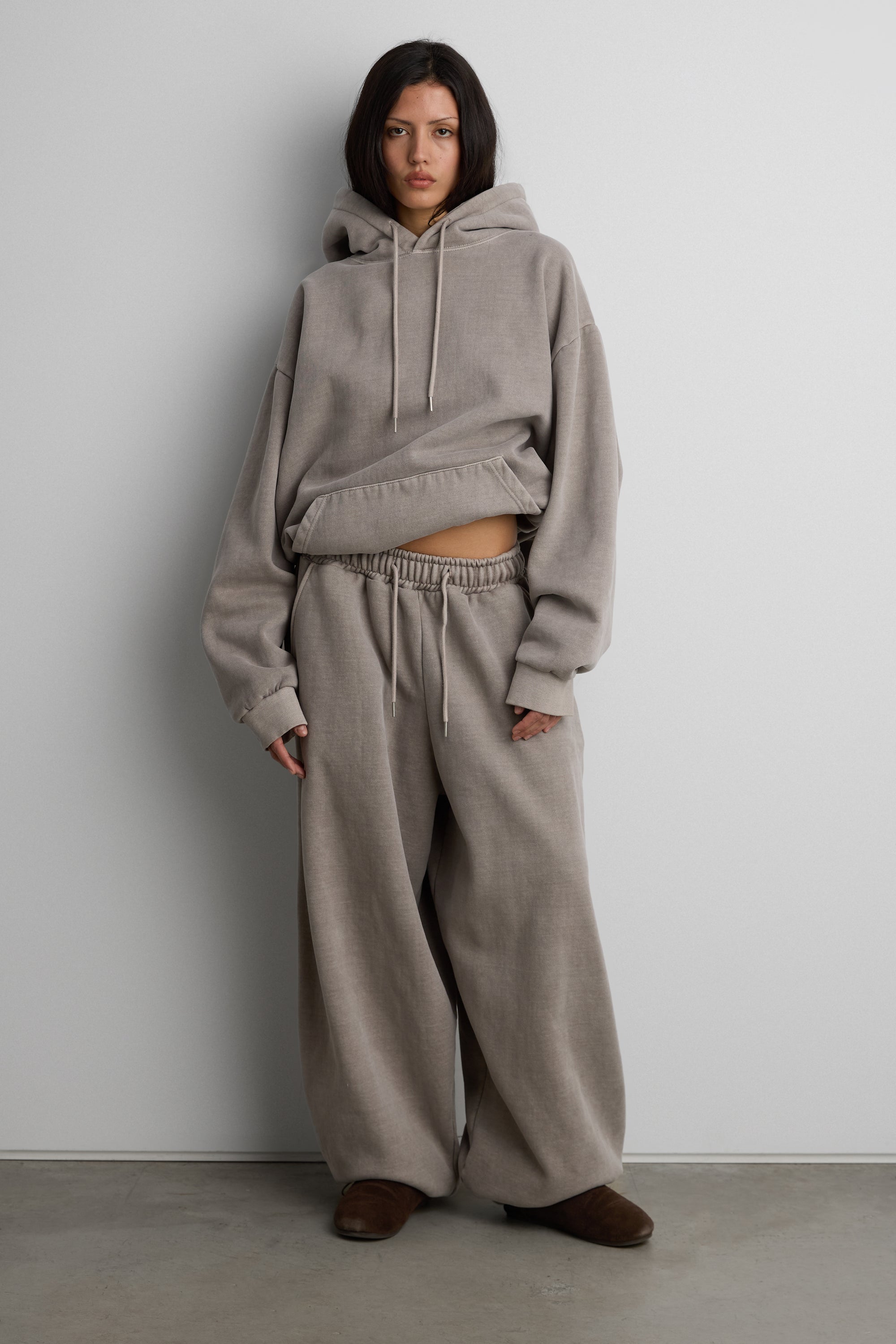 These vintage wash sweatpants feature a relaxed wide-leg silhouette, fleece lined and an adjustable drawstring waistband for everyday comfort. Crafted from a heavyweight cotton blend with a worn-in finish, they offer a laid-back look that's easy to style with tanks, knits, or matching vintage wash pieces.
